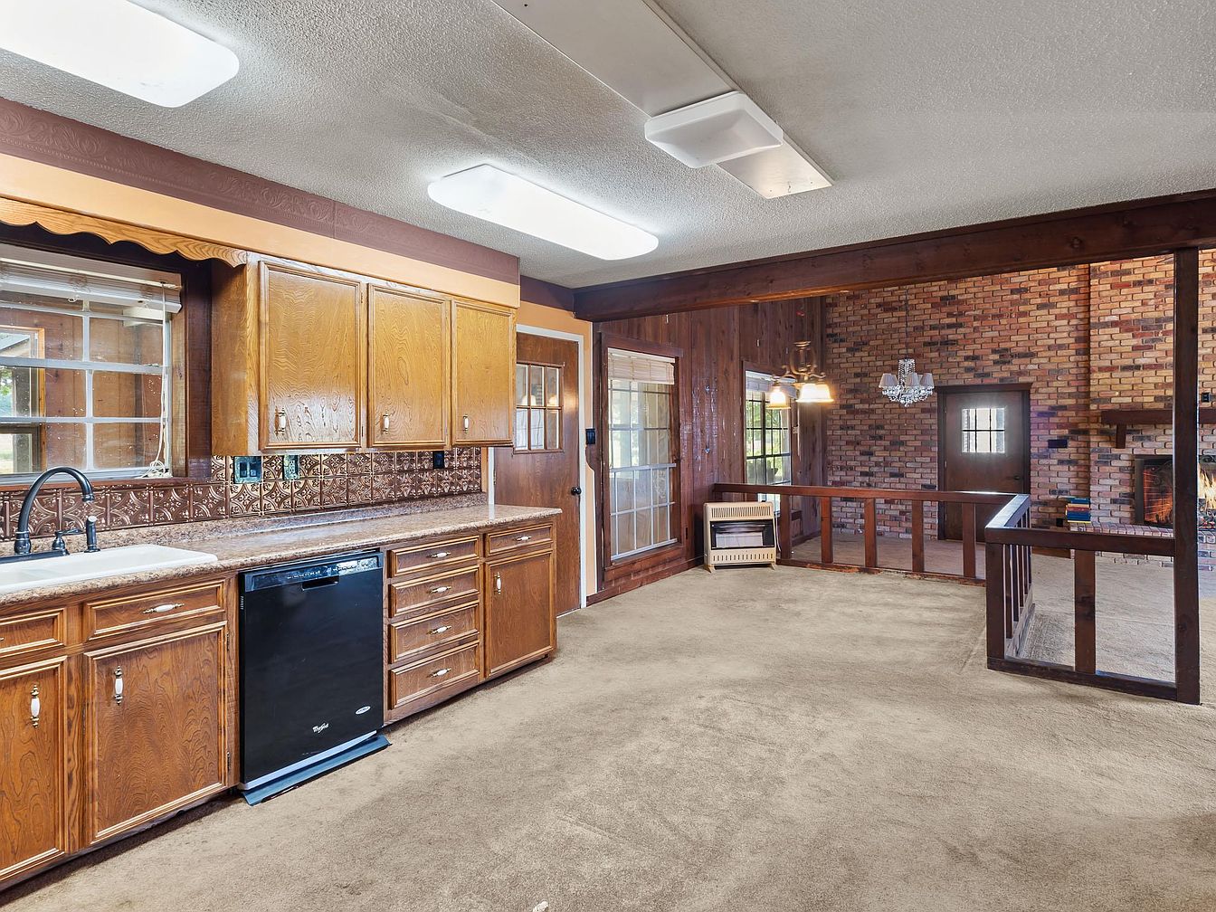 This warm, inviting kitchen opens into a cozy living area, emphasizing rustic charm with a vintage twist. Rich oak cabinetry runs along one wall, topped with a patterned copper backsplash and a speckled granite countertop. A black dishwasher contrasts subtly against the wood finishes. Above, large rectangular fluorescent ceiling lights brighten the space. Beyond the kitchen, dark wood paneling and supporting beams frame an open layout leading to a brick fireplace, adding a focal architectural element. The beige carpet flooring extends throughout, creating flow, while large windows and a classic glass door invite natural light and outdoor views.