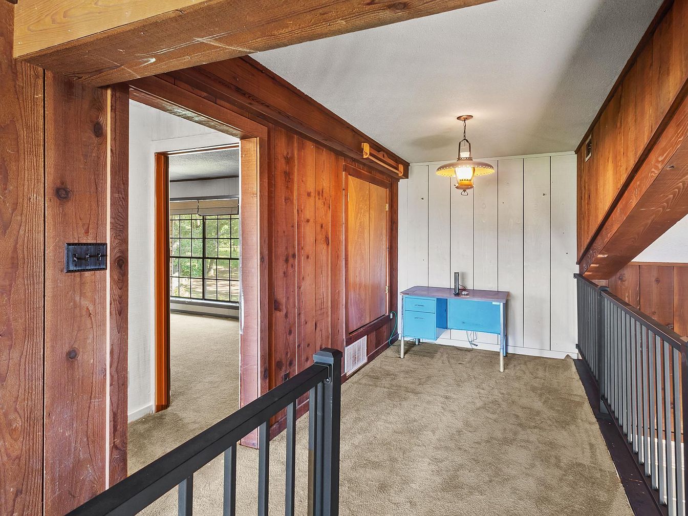 This upper hallway nook offers a cozy, versatile space overlooking a stairwell with black metal railings. Rich, warm wood paneling lines the walls and frames the doorway, contrasting with a white painted wood accent wall at the far end. The carpet is a neutral beige, adding softness underfoot. A small blue desk with metal legs sits against the white wall beneath a vintage-inspired hanging light fixture, introducing a pop of color and character. Through the doorway, a room with large windows and natural light is visible, enhancing the home’s inviting ambiance.