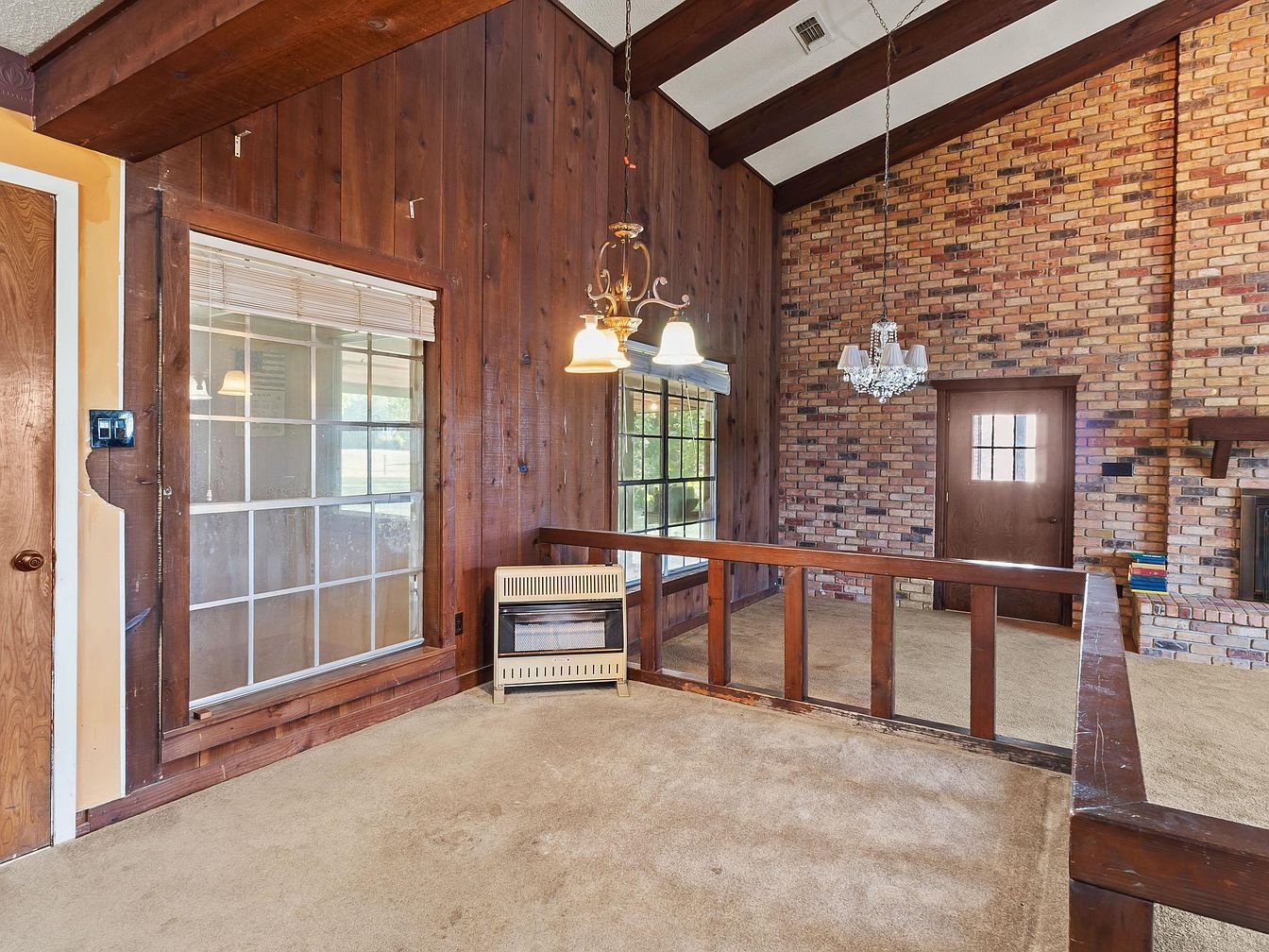 This spacious living area features a striking vaulted ceiling with exposed dark wood beams that contrast beautifully with the light-colored carpet flooring. One entire wall is made of exposed brick, adding a rustic texture and warm ambiance, centered by a wood mantel fireplace with a decorative fire screen. Large windows with black grids allow ample natural light, brightening the warm, earthy palette of wood paneling and brick. Crystal chandeliers and ceiling fans suspend from the tall ceiling, combining classic elegance with functional comfort. The open layout extends towards a dining or kitchen area, marked by wooden railings and posts for subtle separation.