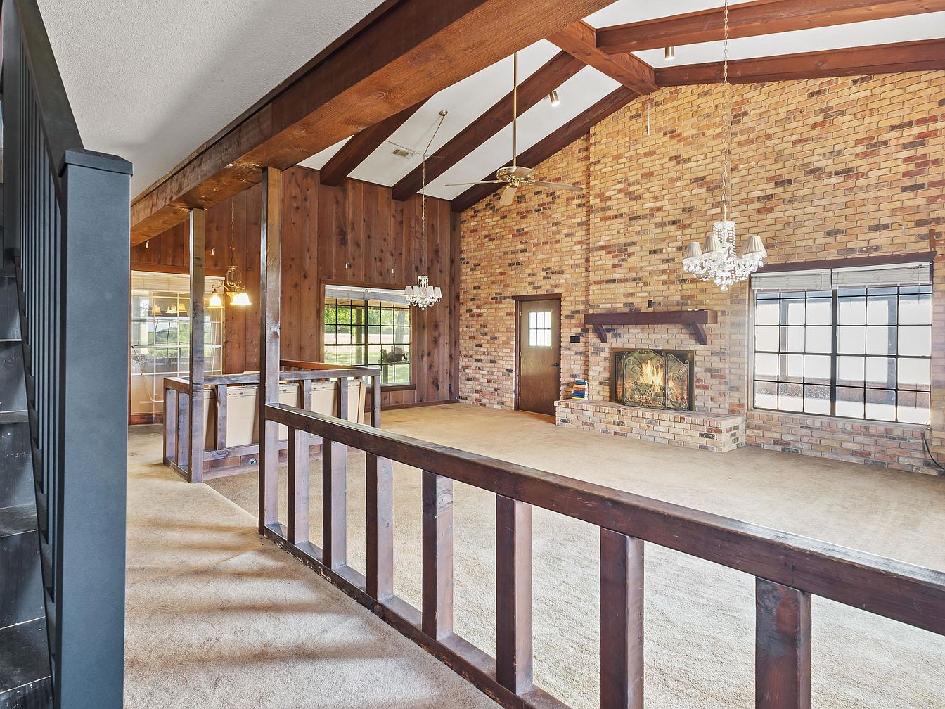 This expansive living room presents a rustic charm with its wood-paneled walls and exposed wooden beams across the vaulted ceiling. A ceiling fan with wood-finish blades hangs centrally, enhancing airflow while complementing the warm tones. The space benefits from a large window that floods the room with natural light, highlighting the beige carpeting that adds softness underfoot. The open layout includes a view of the adjoining kitchen area, while the elevated loft with black metal railings creates a distinct division without closing off the room. The staircase and wood railings emphasize the home’s natural materials and vintage character.