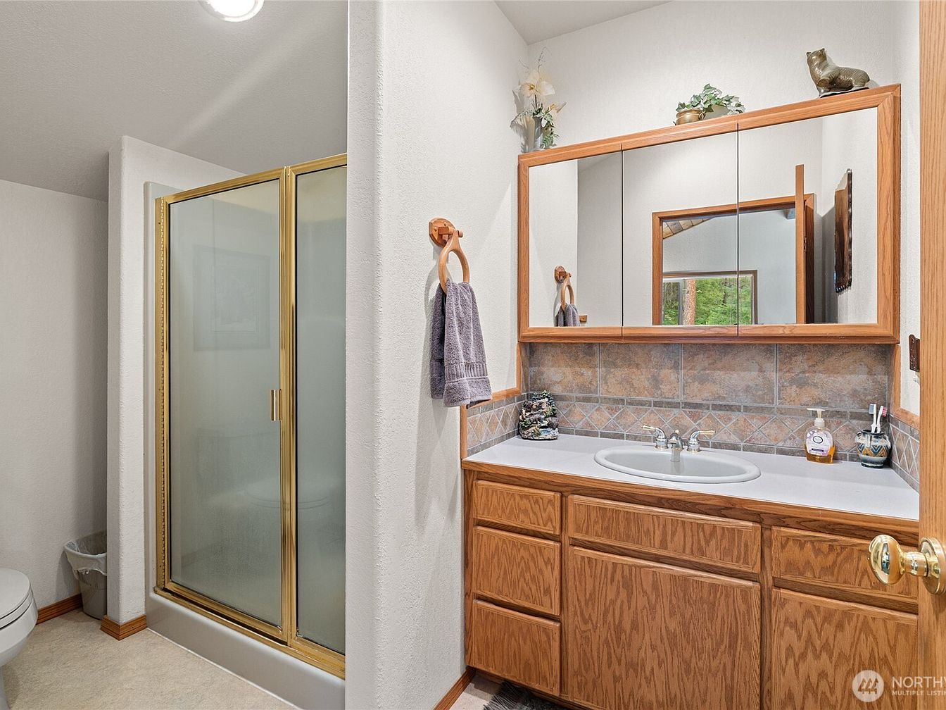 This bathroom features a practical and welcoming layout with a wooden vanity that offers ample storage through multiple drawers and cabinets. The countertop is light-colored with an undermount sink and a dual-handle faucet. Above the vanity, a large tri-fold mirror with a wooden frame enhances the sense of space and light. The backsplash and partial wall tiling add warm earth tones through decorative tile work. To the left, a shower with frosted glass doors enclosed in a golden frame provides privacy while complementing the wooden finishing touches and neutral walls. Soft lighting and minimal decor give this space a clean, approachable feel.