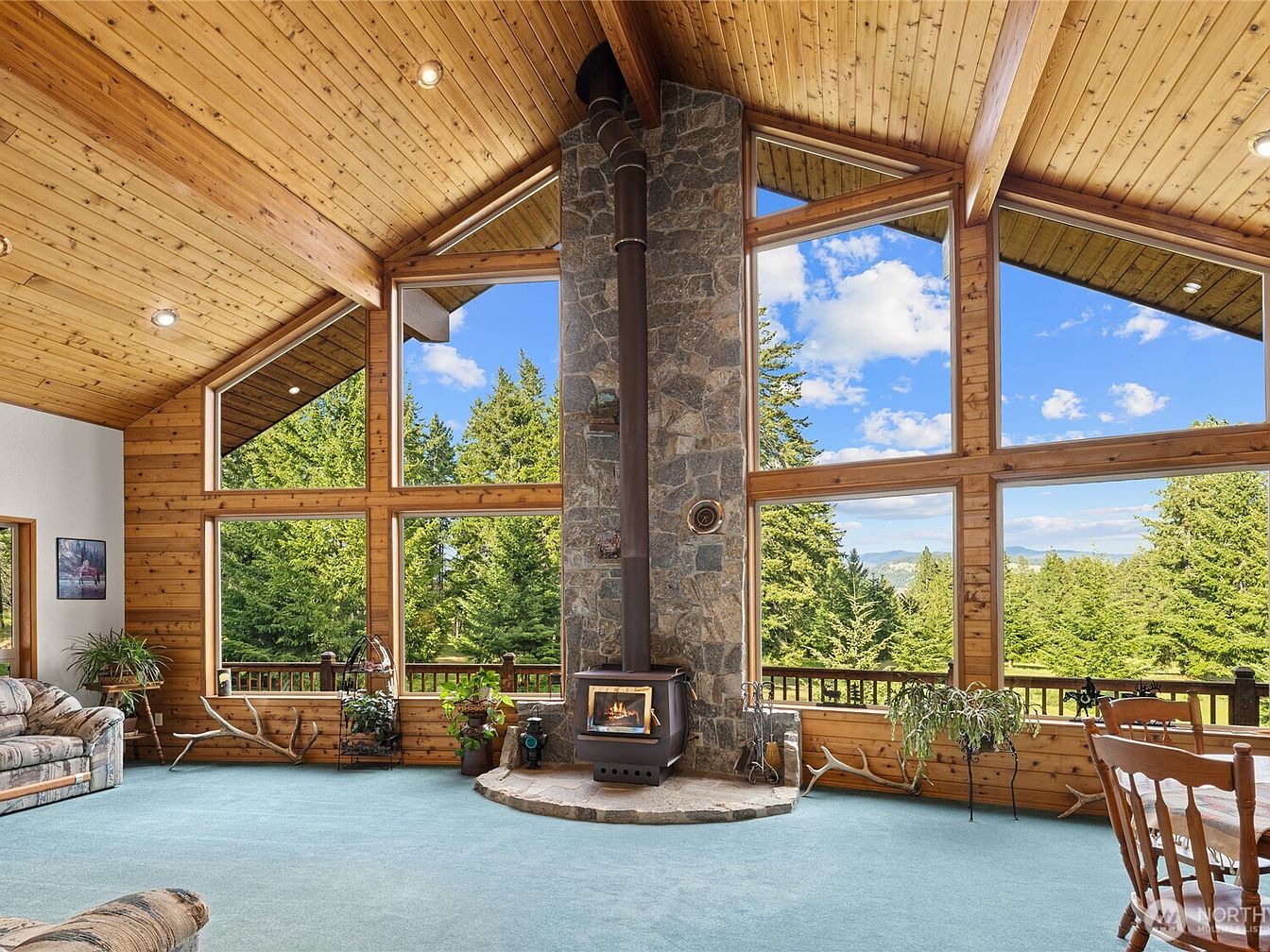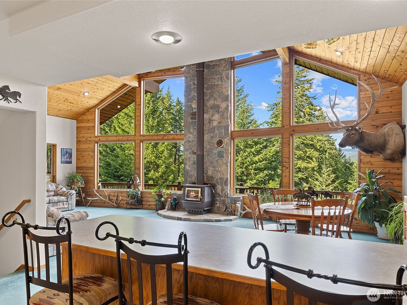 This spacious living and dining area blends rustic charm with captivating natural views. Floor-to-ceiling windows framed in warm wood reveal lush green trees and blue skies, flooding the room with light. The vaulted ceiling, clad in natural wood planks, enhances the open and airy feel. A large stone fireplace centered between the seating and dining spaces provides a cozy focal point, with a contemporary wood stove adding warmth. The décor includes woodland accents like a mounted elk head and basketry, complementing the forest setting. Earthy tones dominate, with wooden furniture, green carpet, and lush plants completing the inviting aesthetic.