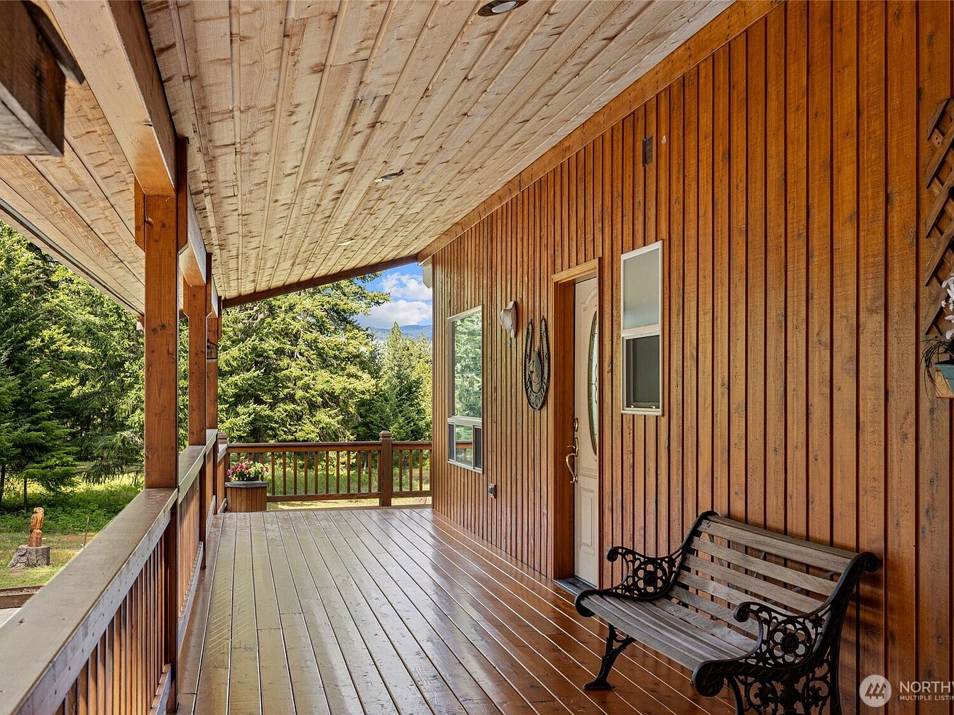 This inviting front porch features rich, warm-toned vertical wood paneling complemented by a smooth, polished wooden floor that reflects natural light beautifully. The ceiling is paneled with lighter wood, adding contrast and a sense of spaciousness. Architectural columns frame the porch, supporting a sturdy overhang that provides sheltered outdoor space with scenic views of lush greenery and distant mountains. A classic wooden bench with ornate black iron armrests adds charm and functionality, encouraging relaxation. The front door, with a frosted oval glass window, completes this welcoming entryway, blending rustic and refined elements harmoniously.