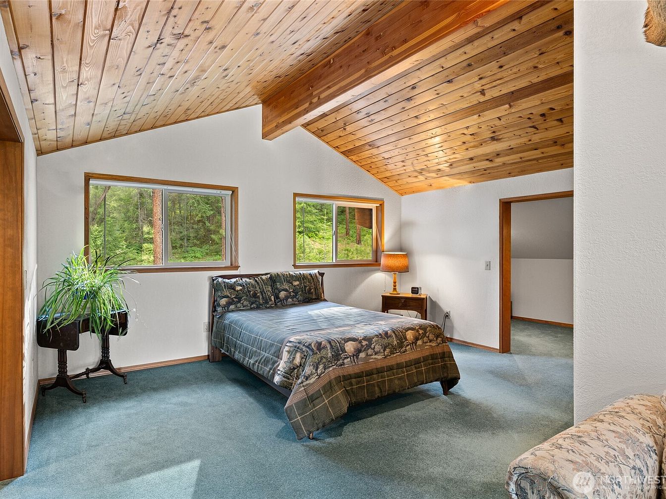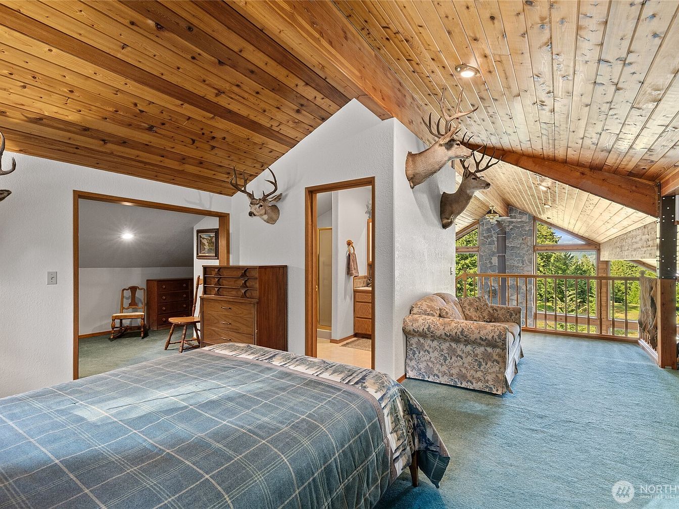 This upstairs bedroom oasis features a cozy blend of rustic and traditional aesthetics. The warm, sloped wooden ceiling contrasts with the cool, soft blue-grey carpeting, creating a welcoming atmosphere. A plaid bedspread and floral-patterned loveseat add a vintage charm to the space. Mounted deer heads on the white walls reinforce the cabin-like, nature-inspired vibe. Natural light floods through large windows revealing lush greenery outside, while a stone fireplace visible beyond the railing adds to the home’s cozy mountain retreat feel. The room layout includes a small adjacent sitting area and an ensuite bathroom, enhancing comfort and privacy.