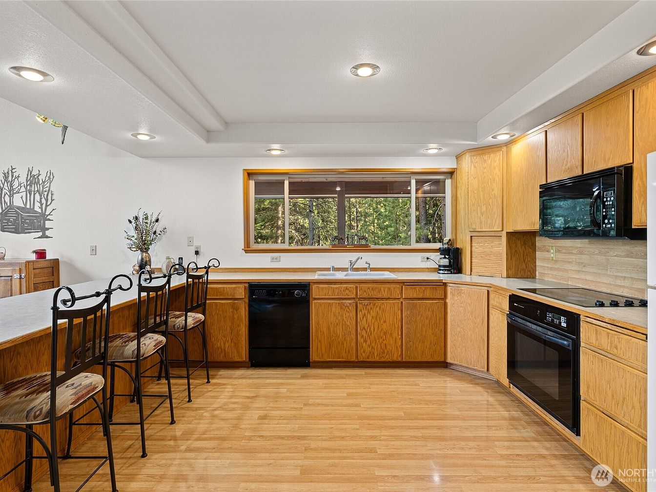 This spacious kitchen features a warm, natural wood theme with oak cabinetry and matching hardwood flooring that creates an inviting atmosphere. The layout includes an L-shaped countertop with ample storage and workspace, complemented by a set of four wrought iron bar stools that introduce a rustic touch with patterned, cushioned seats. Black appliances, including a dishwasher, built-in oven, microwave, and electric stovetop, provide a sleek contrast. A large window above the sink brings in natural light and offers views of the outdoors. Recessed ceiling lights enhance the bright, clean aesthetic, perfect for both cooking and casual dining.