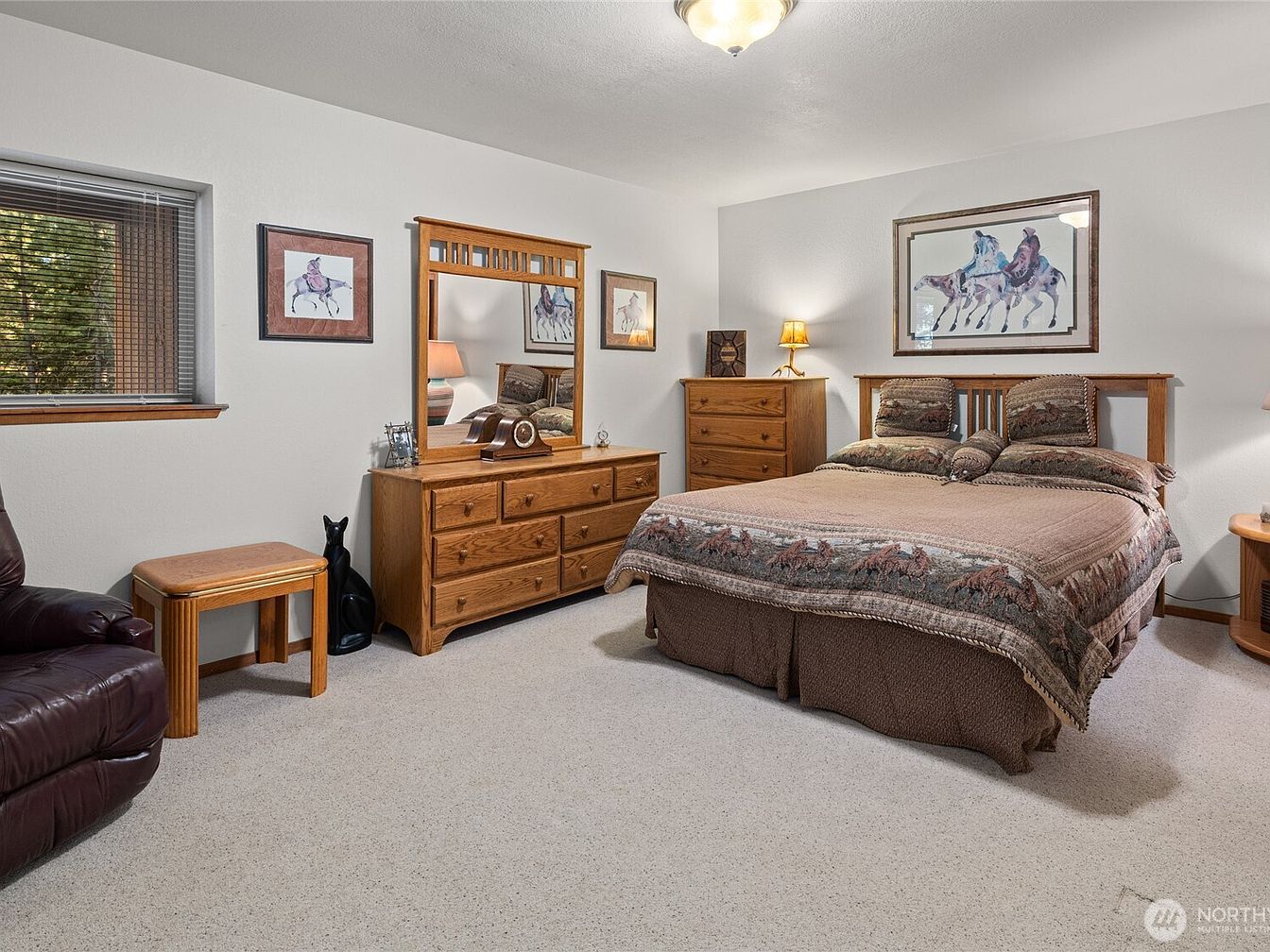 This bedroom presents a warm and inviting atmosphere with a balanced layout featuring a large wooden bed adorned with earthy-toned bedding highlighting a Western equestrian theme. Matching wooden furniture, including a dresser with a framed mirror and a chest of drawers, enhance the room’s cohesive style. Soft carpeting underfoot adds comfort, while the walls are adorned with horse artwork, reinforcing the rustic aesthetic. A dark leather armchair and a small side table offer additional seating options. Neutral wall colors and practical window blinds ensure a serene retreat that merges comfort and traditional charm.