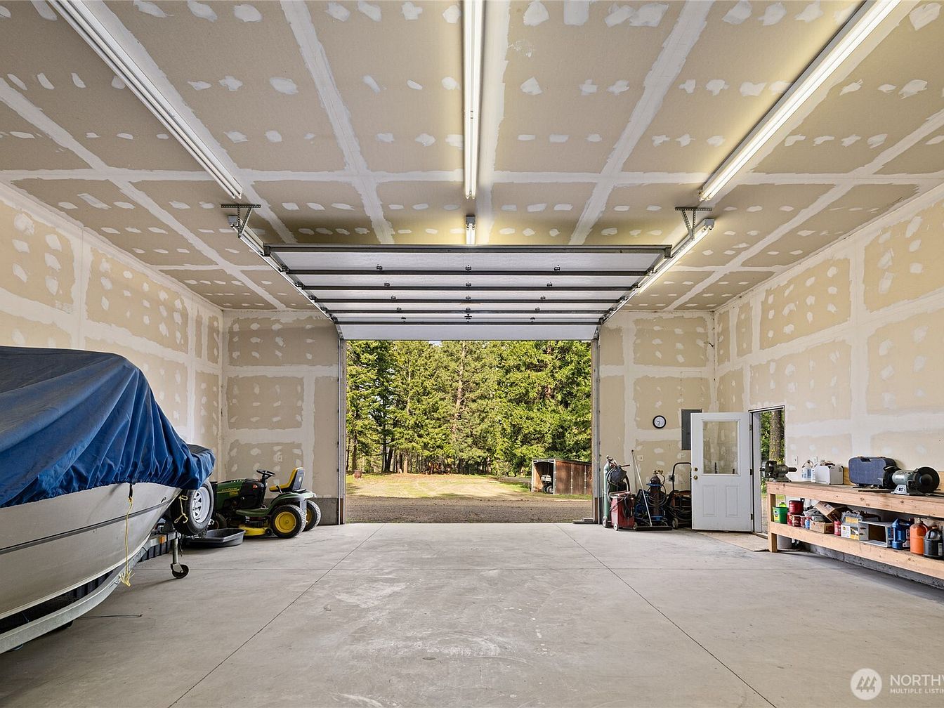 This spacious garage features an unfinished drywall interior with visible seams and patches, creating a clean but utilitarian aesthetic. Fluorescent tube lighting runs along the ceiling, ensuring ample brightness throughout the large concrete floor space. On the left, a covered boat and a green riding lawn mower are neatly stored, reflecting the homeowner’s outdoor lifestyle. To the right, a sturdy wooden workbench is lined with tools, cans, and equipment, while an open white door leads to an adjacent room. The open garage door reveals a scenic view of a wooded area, blending functionality with a natural backdrop.