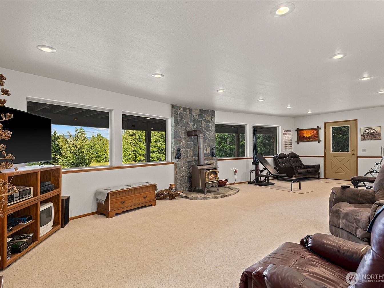 This spacious recreation room features large windows lining one wall, offering a picturesque view of lush greenery outside. The light beige carpet complements the neutral white walls accented with wood trim, creating a warm and inviting atmosphere. A rustic stone fireplace with a wood stove insert anchors the space, adding cozy charm. Furnishings include comfortable dark brown leather recliners and a loveseat, paired with a mix of wooden storage furniture and shelving housing a television and audio equipment. The far end includes exercise equipment, blending relaxation with fitness functionality, and the space is illuminated by recessed ceiling lights.