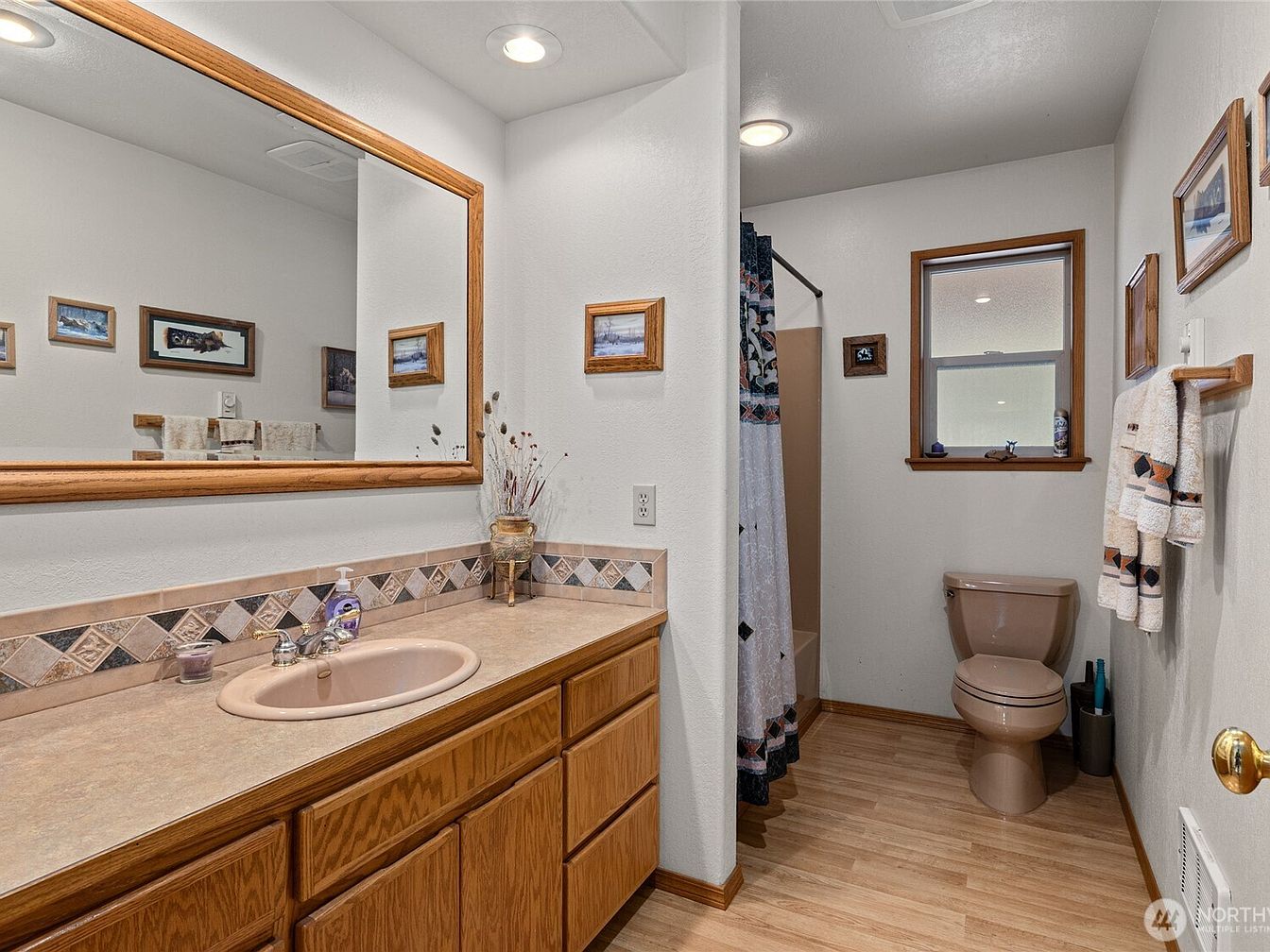 This bathroom features a practical layout with a beige sink embedded in a wide countertop that spans oak cabinetry below. The backsplash showcases a decorative diamond-patterned tile border adding subtle visual interest. A large mirror with a matching oak frame sits above the sink, reflecting the room and enhancing its brightness. The floor is a warm wood-tone laminate, complementing the cabinetry. Recessed lighting provides a clean, contemporary feel. The toilet, in a muted tan color, is positioned next to a window framed in wood trim. Coordinated towels and modest wall art create a cozy, inviting atmosphere.
