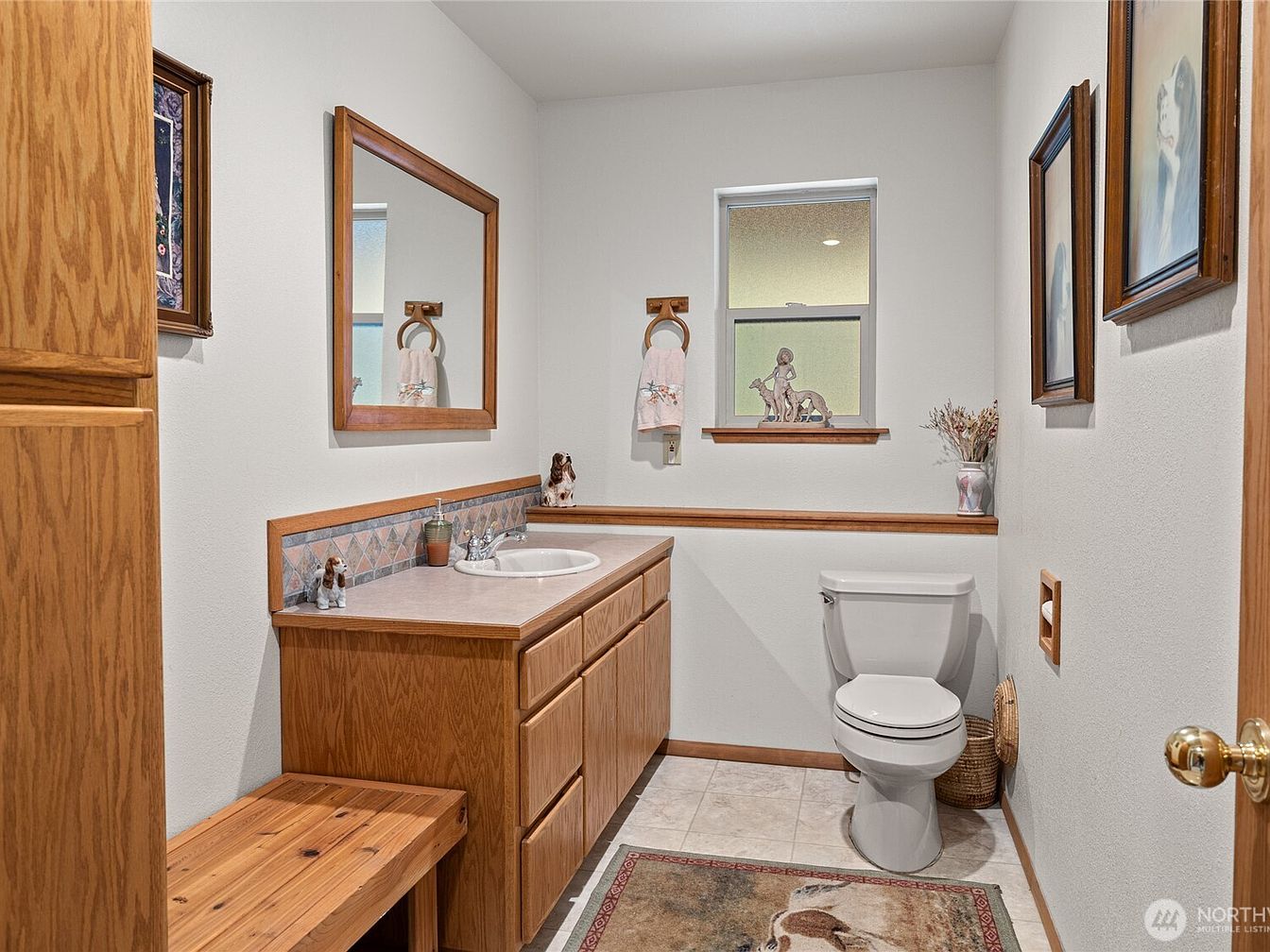 This bathroom features a warm, inviting design with natural wood tones dominating the space. The vanity is made from medium-toned oak wood with multiple drawers and cupboards underneath a beige countertop that houses a single oval sink. Above the vanity is a large wooden-framed mirror that complements the cabinetry. The backsplash along the vanity is decorated with a diamond-patterned tile in muted earth tones. A wooden towel ring is mounted on the wall beside the mirror, with a softly embroidered hand towel. The white toilet sits adjacent to the vanity, with a wicker wastebasket nearby. The walls are painted a clean, soft white, accented by two framed prints of dogs and a small window with frosted glass letting in natural light. A patterned rug with dog motifs adds a cozy and personal touch to the tiled floor, completing the room’s charming, rustic ambiance.