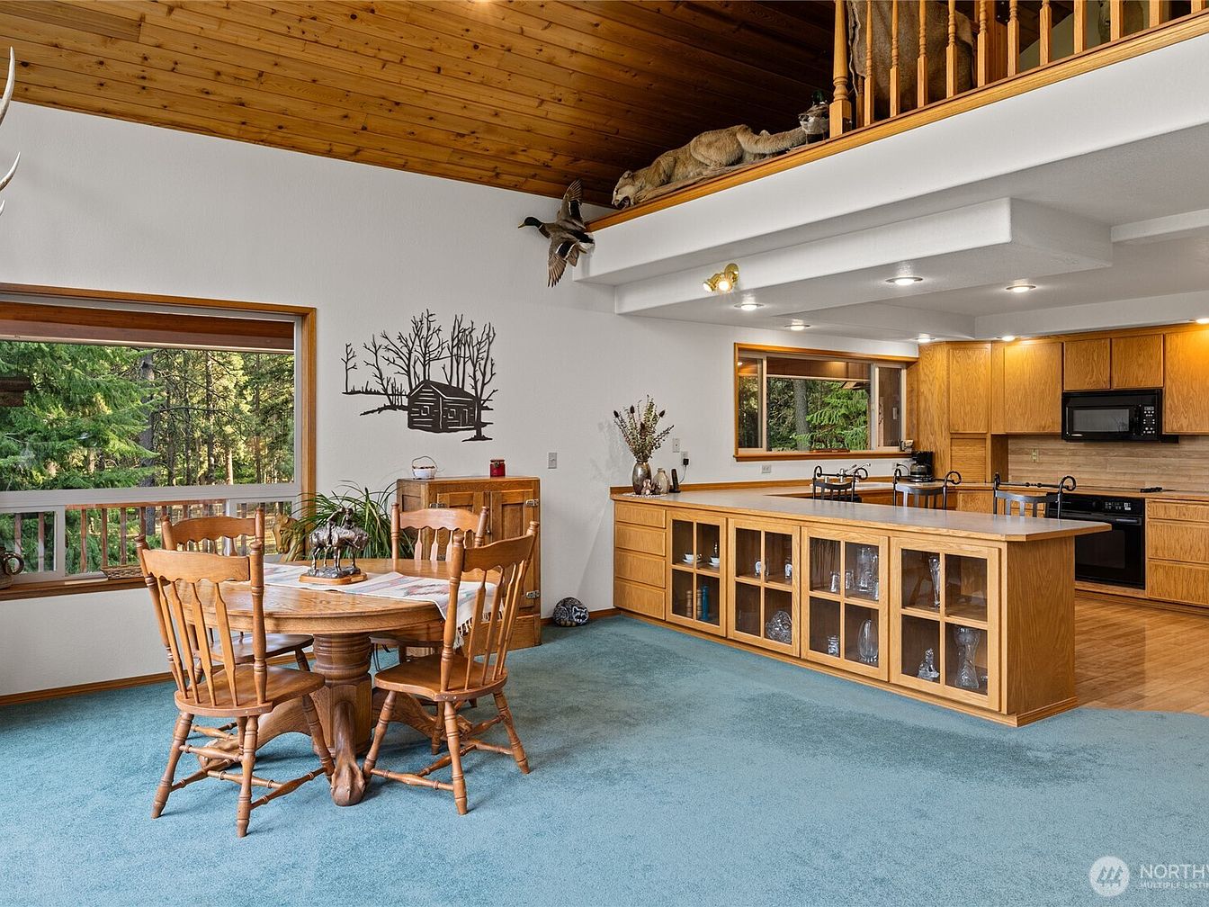 This open-plan kitchen and dining space warmly combines natural wood accents with a cozy atmosphere. The dining area features a round wooden table surrounded by four spindle-back chairs resting on plush blue carpeting that adds a soft contrast to the wood tones. Adjacent is a spacious kitchen with an expansive island incorporating glass-front cabinetry that showcases elegant glassware. Light oak cabinetry lines the walls under recessed lighting, with black appliances integrated seamlessly. Wide windows frame verdant outdoor scenery, allowing natural light to enhance the wood paneled ceiling and decorative wildlife elements, creating a rustic yet inviting ambiance.