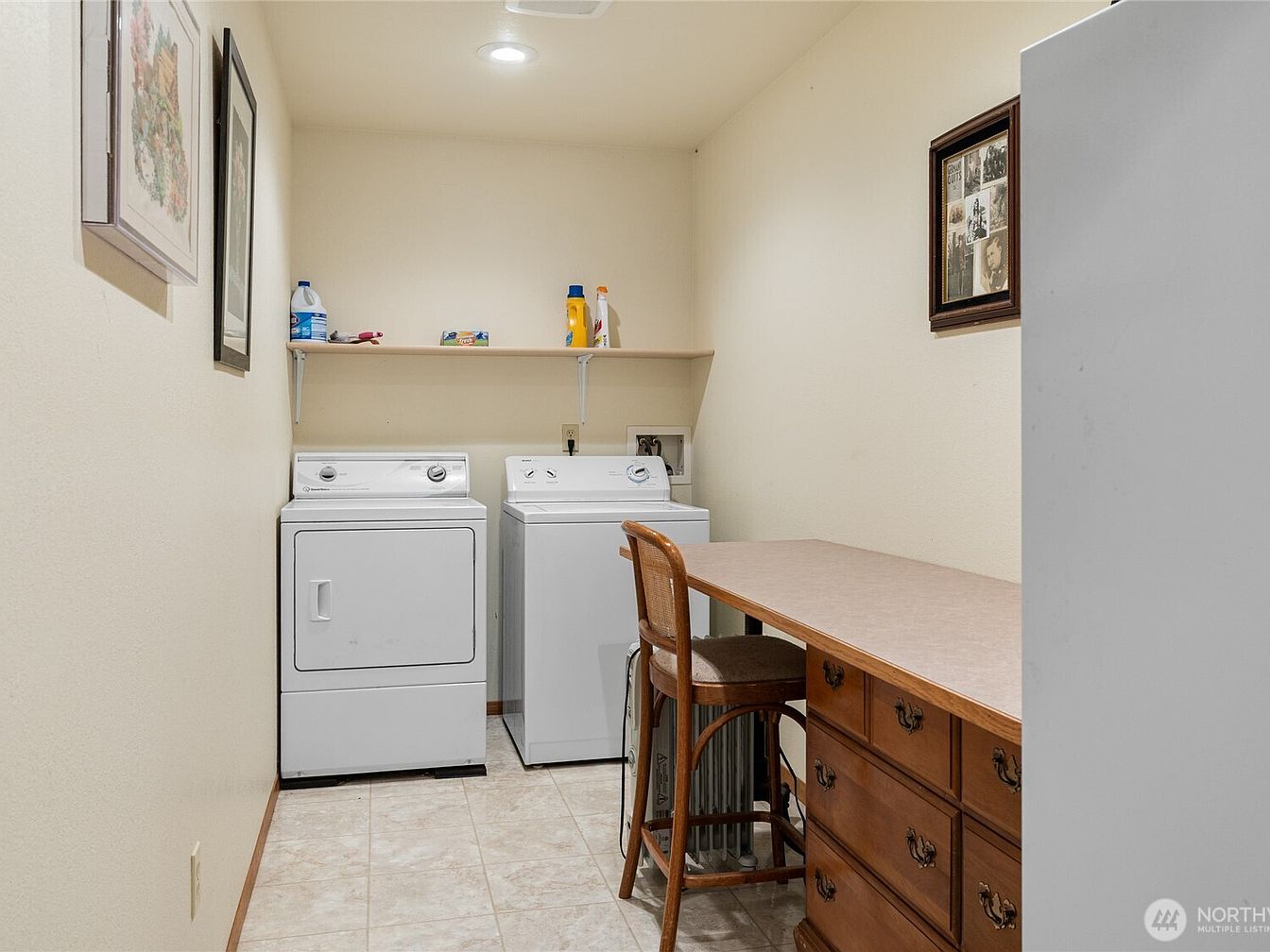 This compact laundry room combines functionality with simple design. On the left, a white washing machine and dryer sit side by side beneath a single wooden shelf holding laundry essentials. The floor is tiled in a light beige pattern that complements the pale cream walls, creating a neutral backdrop. Opposite the appliances, a wooden desk with multiple drawers adds a vintage touch and doubles as a folding or workspace. Accompanied by a wicker chair, the desk area is illuminated by overhead recessed lighting. The wall decor includes framed pictures, adding a personalized, homey feel to the practical space.