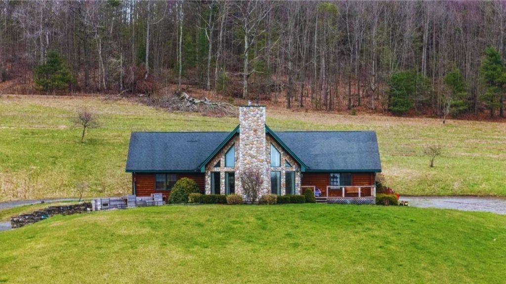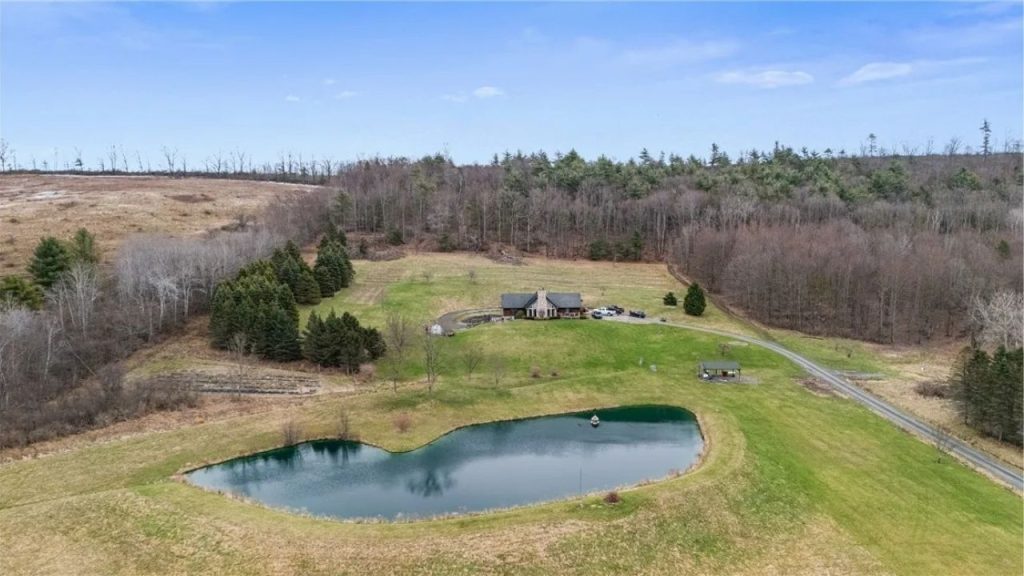 This charming lodge-style home is a peaceful escape set on over 33 acres of rolling countryside. The rustic wood exterior and striking stone chimney create a cozy, inviting presence against the open landscape. Tall windows frame serene pond views, while the wide front lawn offers endless outdoor possibilities. The surrounding woods add a quiet sense of privacy, making this a true retreat in nature.