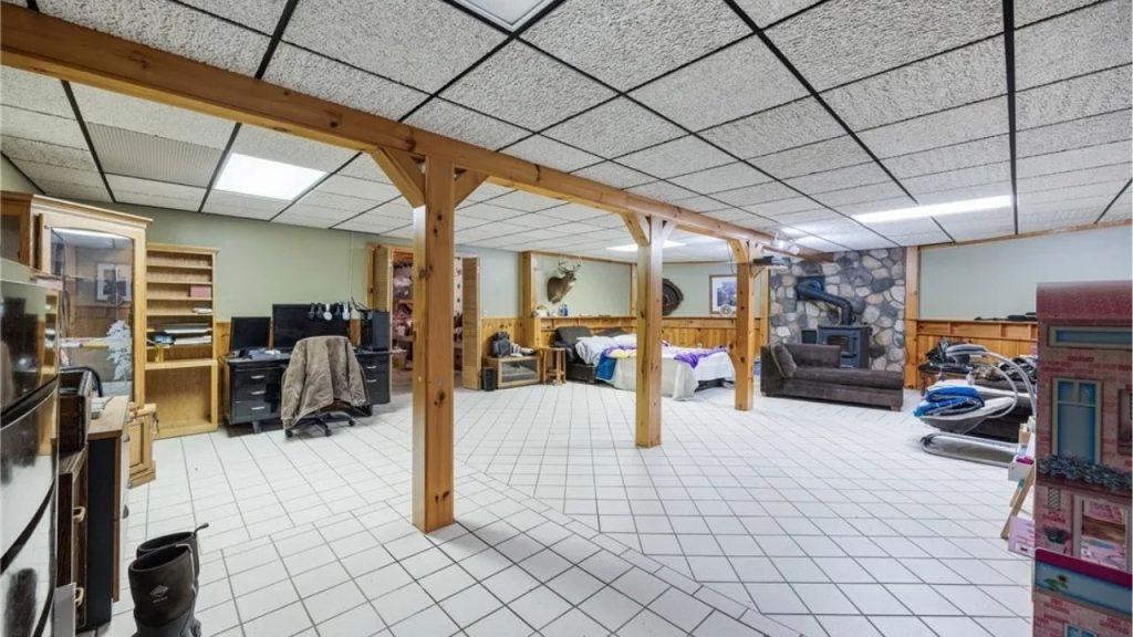 This sprawling basement offers a versatile haven, blending practical workspaces with cozy relaxation areas. Timber posts and soft green walls create a welcoming lodge-like feel, while a rugged stone fireplace anchors the far end with warmth and character. White tile flooring brightens the open layout, offering flexibility for everything from office tasks to lounging by the fire, much like a cabin retreat after a busy day.