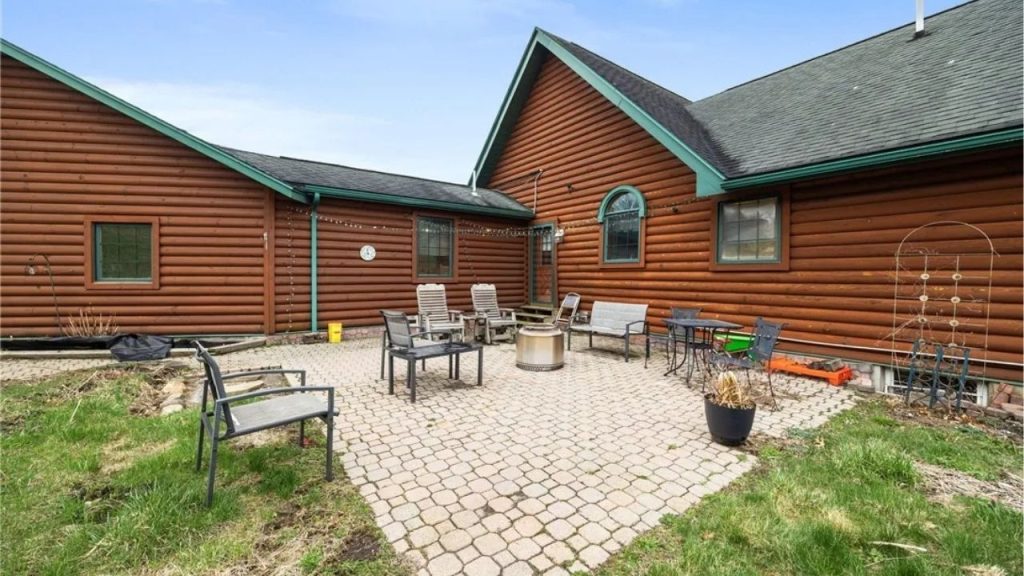 This inviting courtyard blends rustic charm with functionality, featuring a cobblestone patio framed by the warm tones of the log cabin exterior. A central fire pit creates a natural gathering spot, surrounded by ample seating for family and friends. String lights overhead add a festive touch, making this outdoor space ideal for both quiet evenings and lively get-togethers.