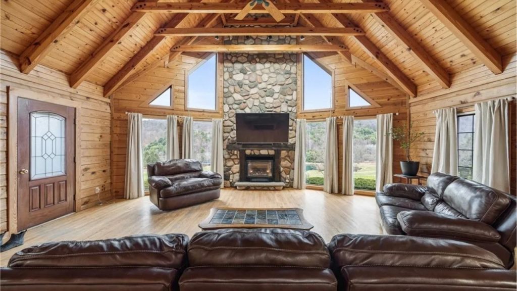 This stunning great room combines rustic elegance with modern comfort, featuring soaring vaulted ceilings with exposed beams and a dramatic floor-to-ceiling stone fireplace. Expansive windows frame breathtaking countryside views, flooding the space with natural light. Rich leather seating and warm wood finishes create a cozy, inviting atmosphere perfect for relaxing or entertaining.