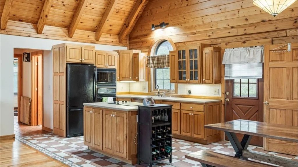 This cozy kitchen radiates warmth with its rich wood finishes and soaring vaulted ceiling clad in knotty pine. Natural light filters through a charming arched window above the sink, highlighting the classic cabinetry and checkerboard tile flooring. A central island with a wine rack adds function and style, while black appliances and a country-style door enhance the rustic, inviting atmosphere.