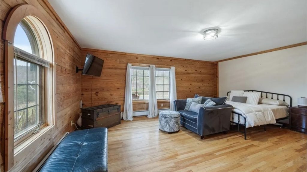 This inviting bedroom blends rustic charm with modern comfort, featuring natural wood walls and rich hardwood flooring. A large arched window and a double-paneled window allow soft daylight to pour in, creating a serene ambiance. A sleek black bed frame and deep blue seating add a stylish contrast, while simple white curtains and a vintage trunk accentuate the room’s relaxed, cabin-like feel.