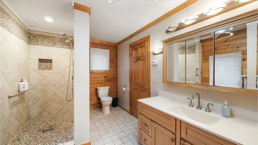 Blending rustic textures with clean lines, this spacious bathroom feels both fresh and cozy. A walk-in shower features earth-toned tile work and a mosaic border that adds a subtle, elegant flair. The natural wood vanity and matching mirror frame bring warmth to the bright, neutral space. A simple yet stylish light fixture above the sink ties the room together, creating a calm and welcoming retreat.