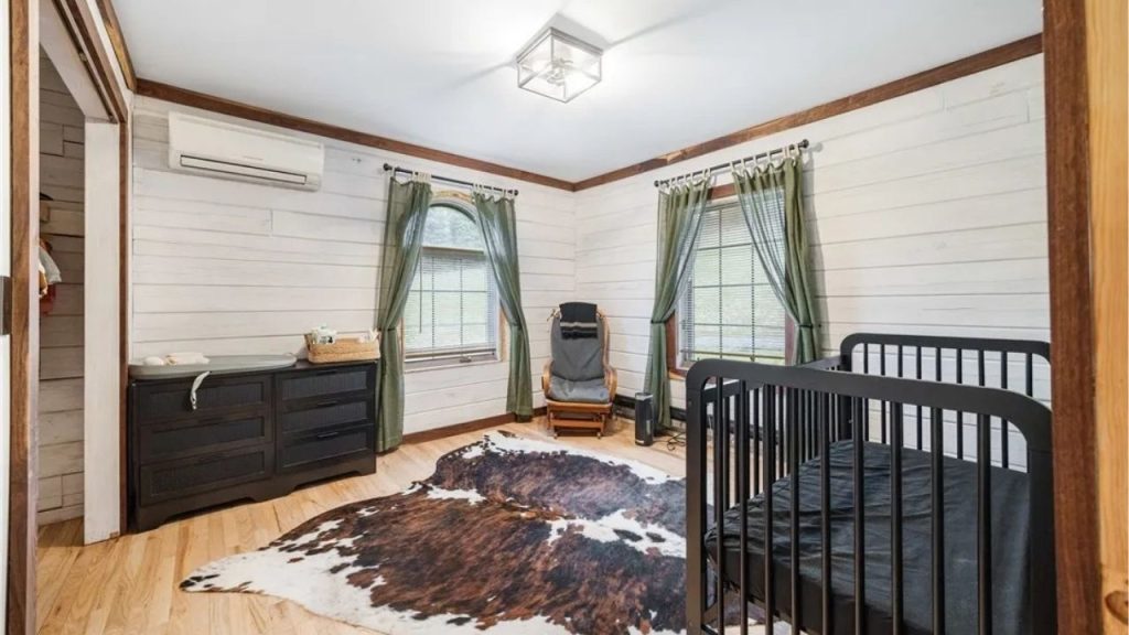 This inviting nursery blends rustic charm with modern comfort, featuring white shiplap walls and rich wood trim for a warm, textured backdrop. A sleek black crib and dresser introduce a bold contrast, while green drapes soften the sunlight filtering through arched and square windows. Centered on the hardwood floor, a large cowhide rug adds a playful yet rugged touch, perfectly grounding the room’s natural and cozy atmosphere.