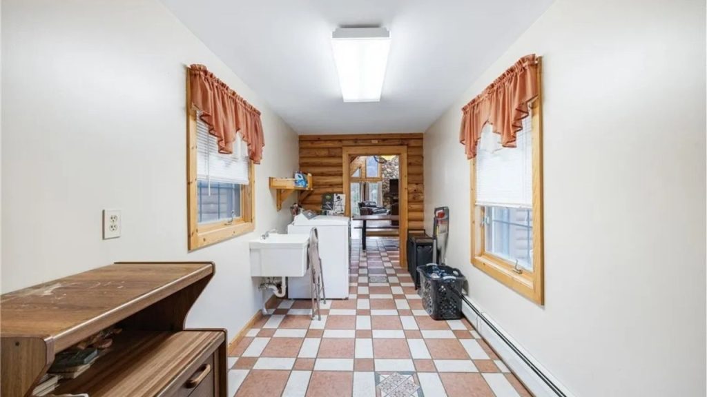 This functional laundry room brings a cozy, rustic feel with its warm wood trim and playful checkerboard tile flooring. Natural light streams through twin windows adorned with cheerful ruffled valances, while a deep utility sink adds classic farmhouse utility. At the far end, a glimpse of log cabin walls and vaulted windows invites a seamless connection to the home’s inviting living spaces beyond.