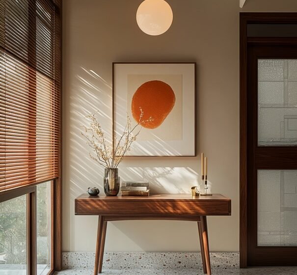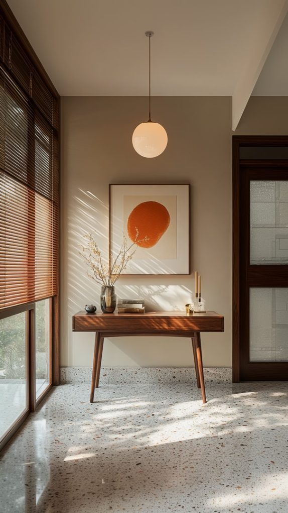 A mid-century modern inspired hallway with beige walls and sleek furniture. The simple yet striking artwork and a minimalist side table give the space a clean, contemporary feel.