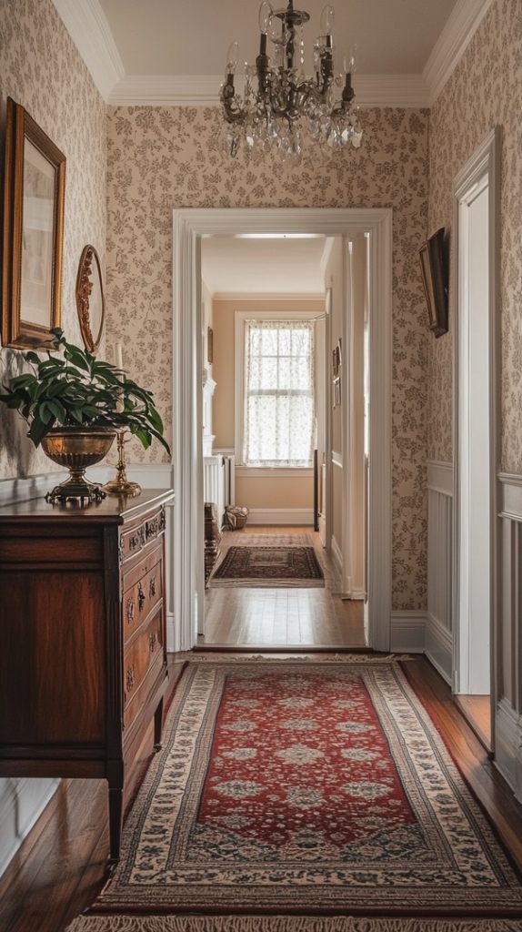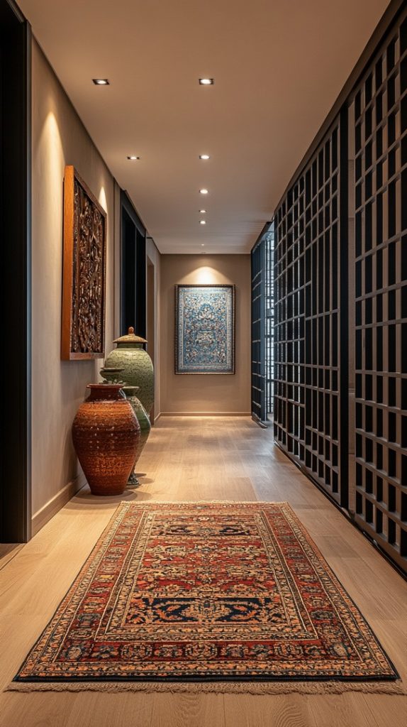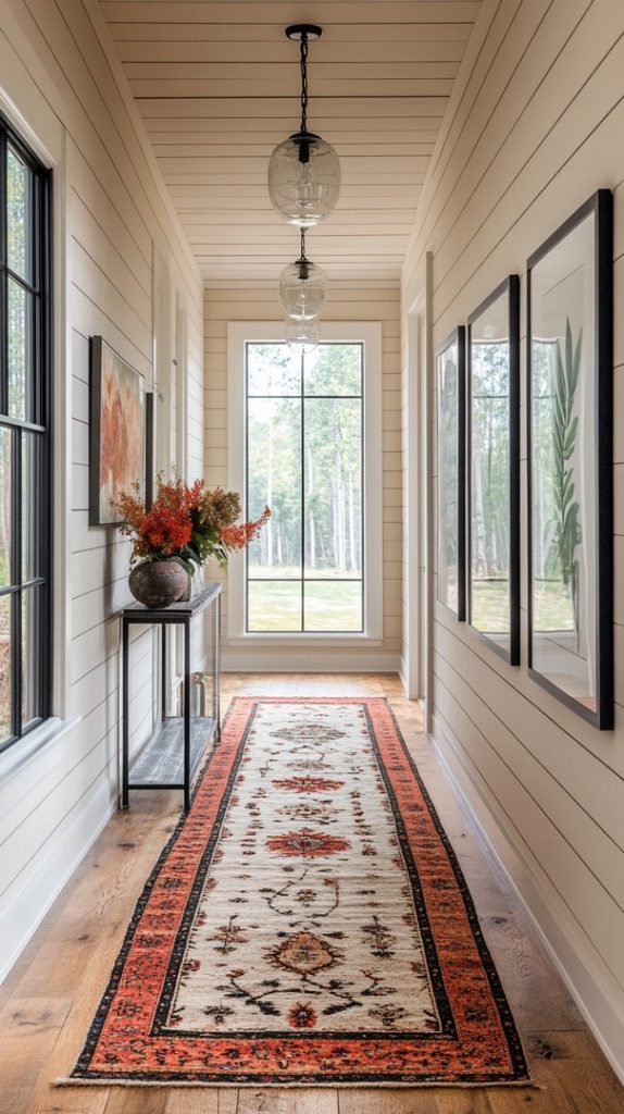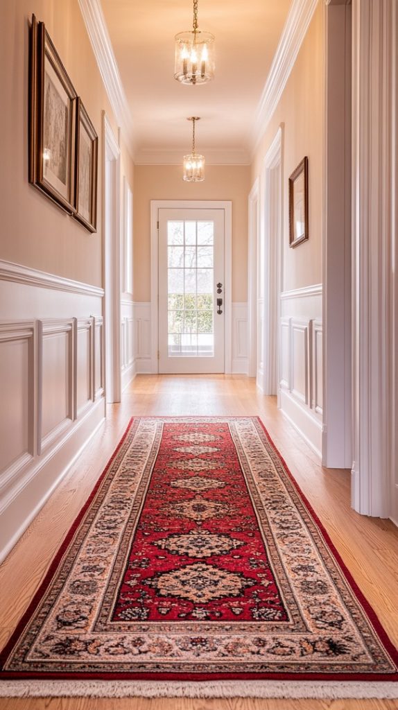 This hallway showcases a stunning contrast between the soft beige walls and a bold red Persian-style runner. The long, narrow space feels grounded and inviting, perfect for a sophisticated entrance.
