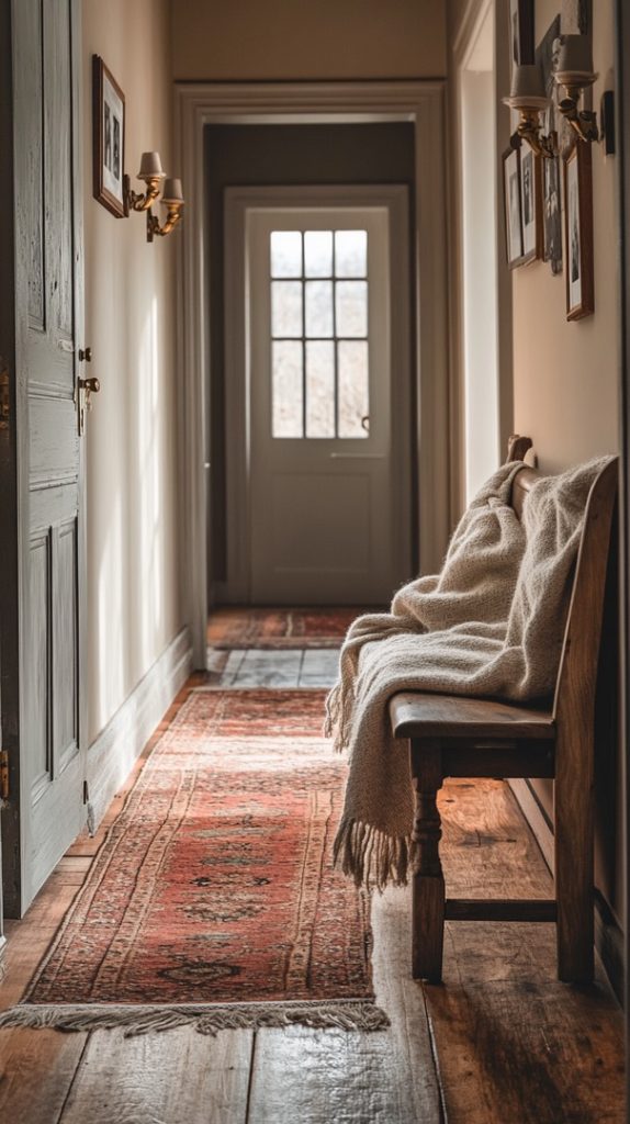 A warm and inviting hallway featuring a classic vintage rug that adds character to the neutral beige walls. The soft lighting and subtle décor create a cozy, lived-in ambiance.