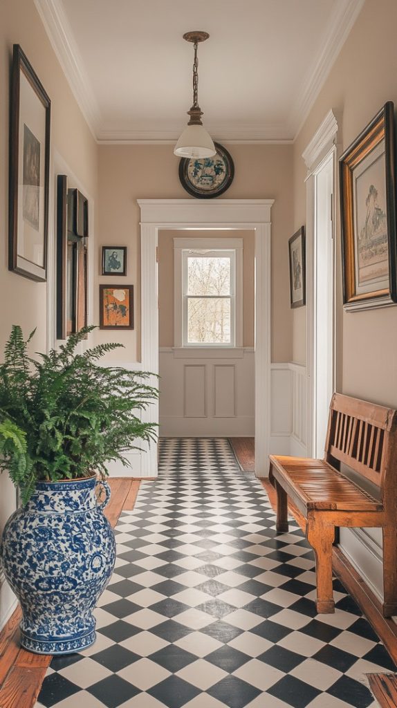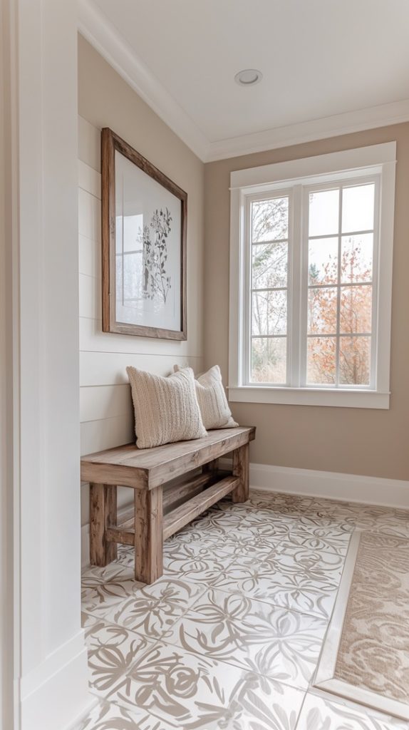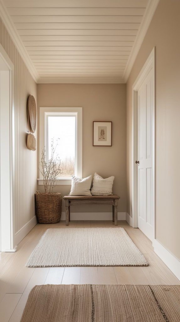 A wooden bench and rustic elements paired with neutral beige walls make this hallway a harmonious and inviting space. The natural light enhances the soft tones.