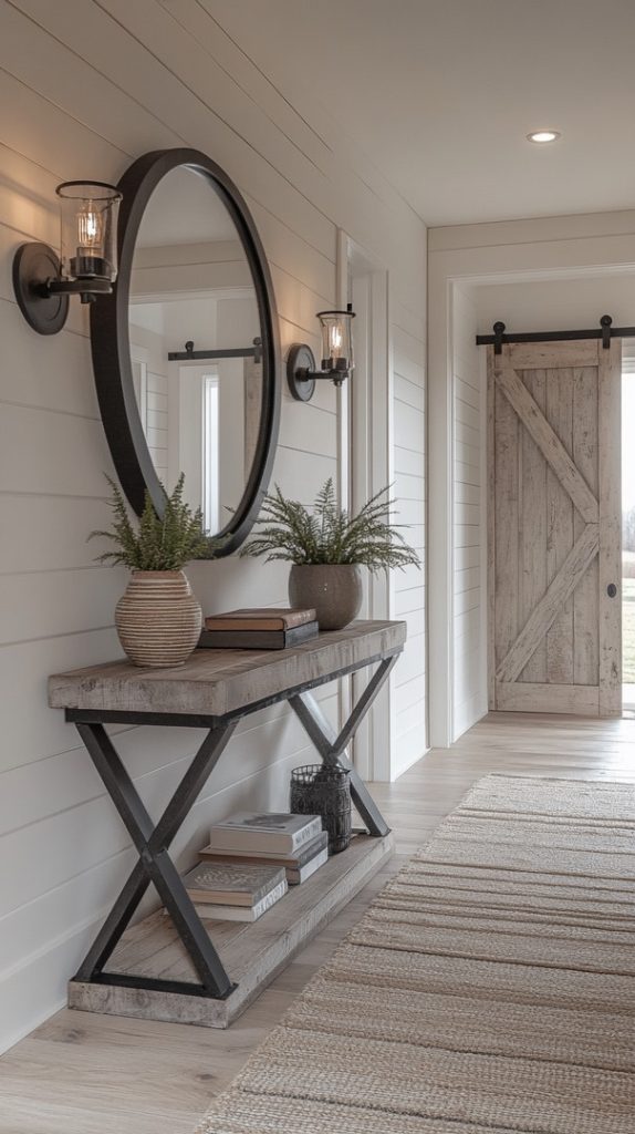 A circular mirror and a simple beige console table create an elegant focal point in this small hallway. The beige walls keep the space light and inviting, while the décor adds a modern touch.