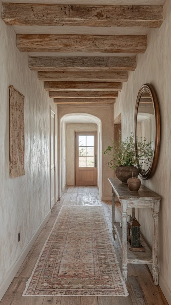 This hallway blends rustic charm with modern simplicity, featuring exposed wooden beams and a traditional beige runner. The neutral walls highlight the natural materials, making the space feel both cozy and open.