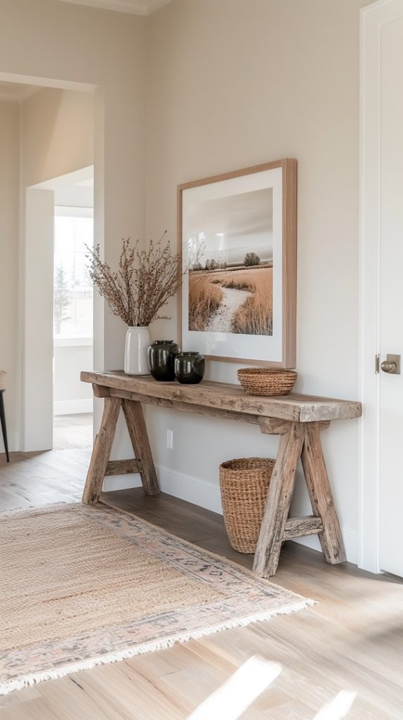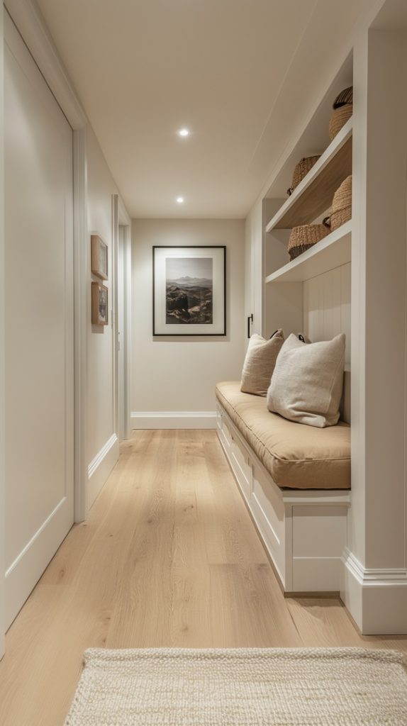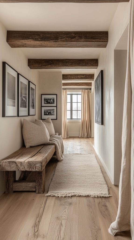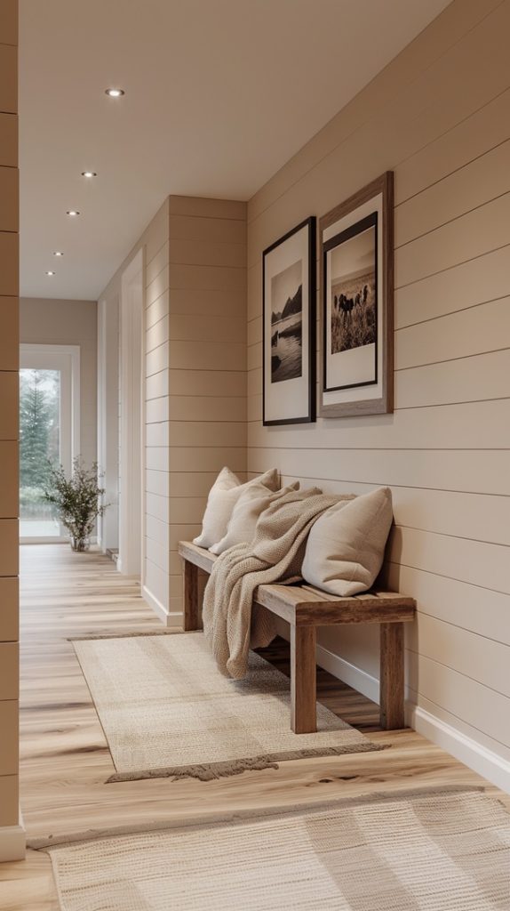 This hallway features a relaxed, rustic vibe with a simple wooden bench and soft beige tones. The light wood floors and minimalist décor make it a calming and welcoming space.