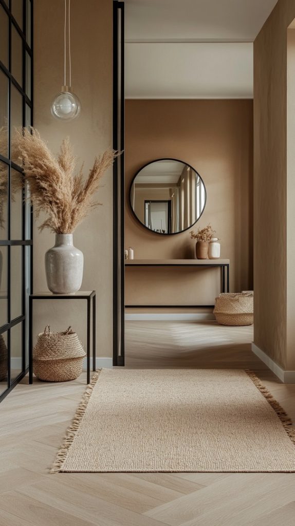 This narrow hallway feels spacious thanks to the clever use of mirrors and wooden accents. The beige tones provide warmth, while the minimalist furniture keeps the space uncluttered and functional.