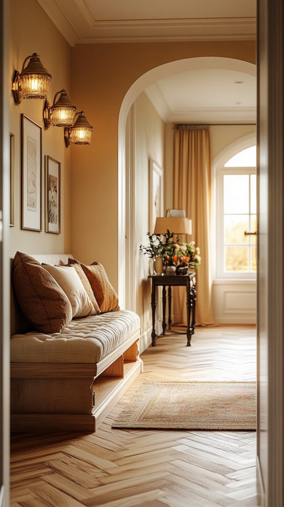 This bright hallway blends beige tones with natural wooden flooring, creating a warm, welcoming space that feels both classic and contemporary.