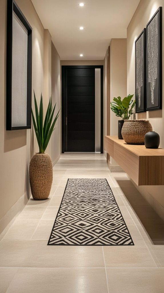 The addition of a vibrant runner contrasts beautifully with the beige walls, making this contemporary hallway both functional and stylish.