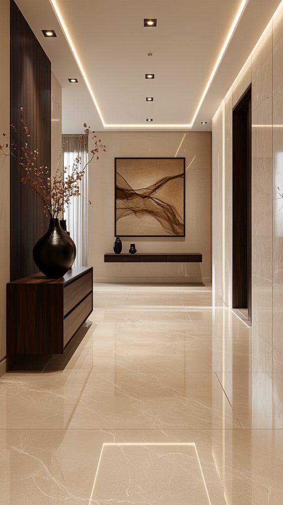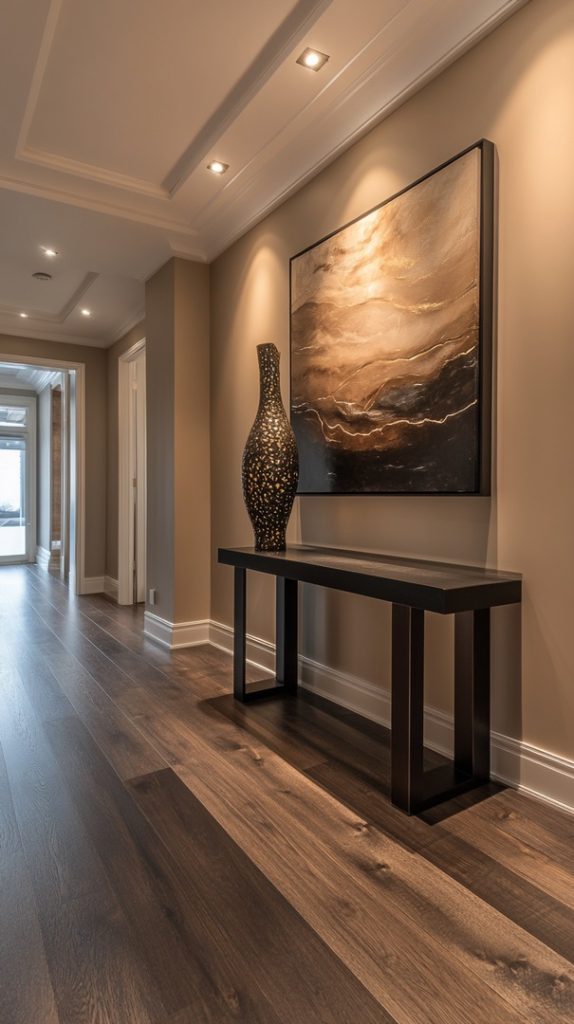 This hallway blends spaciousness with warmth, featuring bold statement art against neutral beige walls. The dark wooden console and modern lighting elevate the space’s chic design.