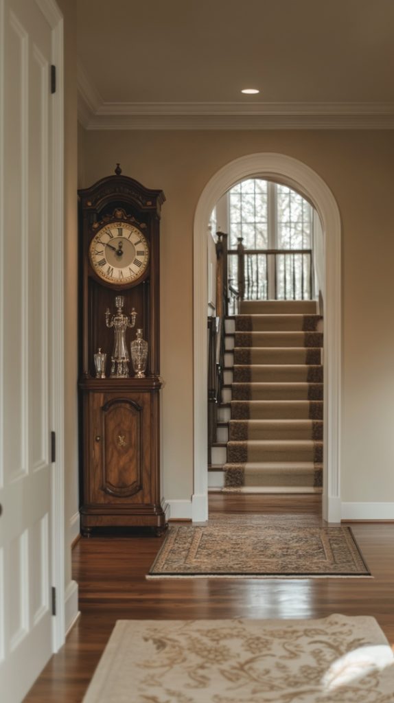 The hallway exudes old-world charm with a large, traditional clock standing against the warm beige walls, perfect for a timeless design.