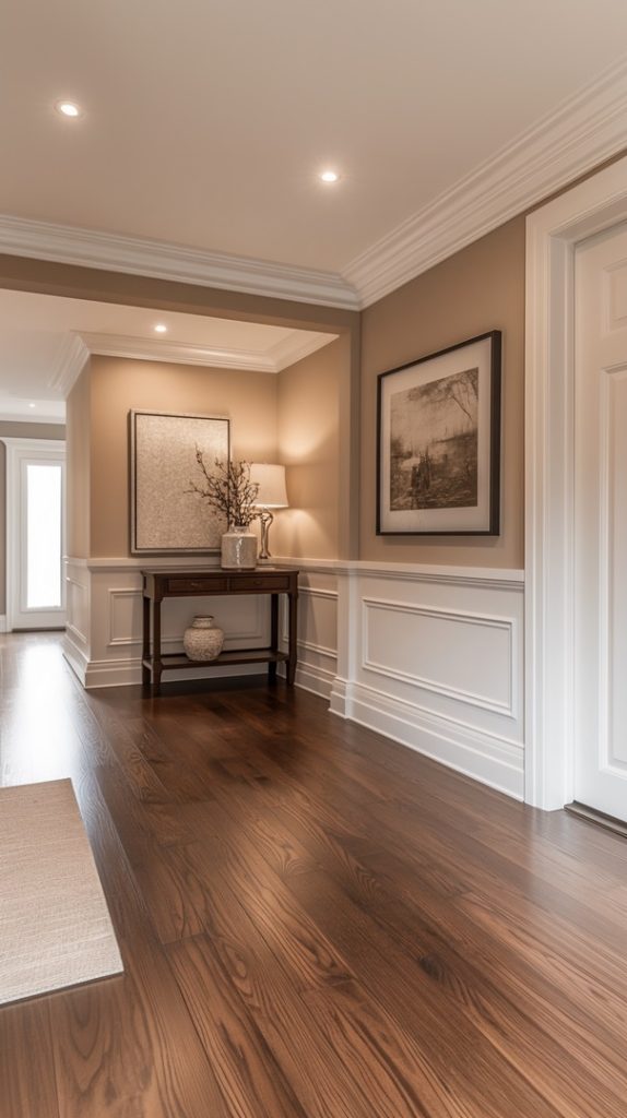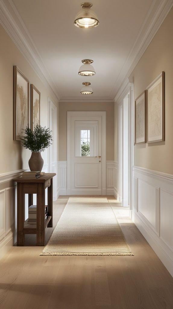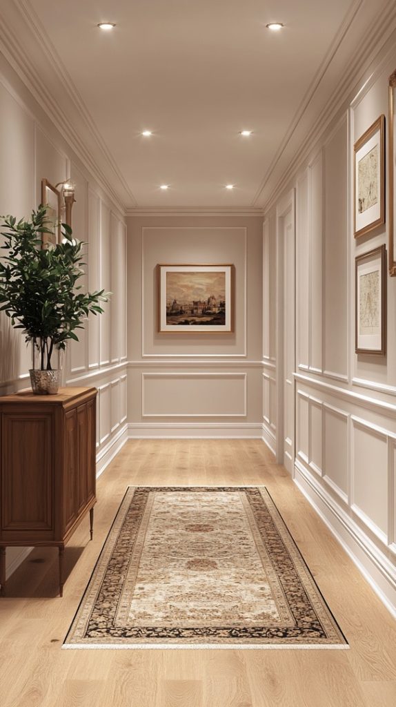 This hallway boasts elegant wainscoting on the walls, paired with soft beige tones. The subtle details in the décor, such as framed art and a long runner, enhance the sophisticated feel of the space.