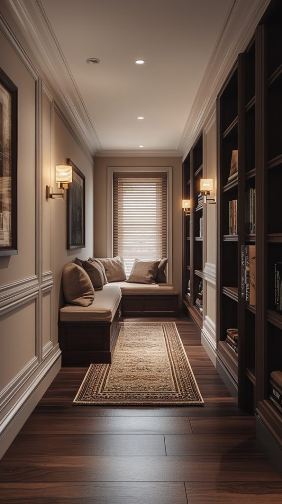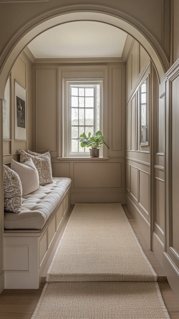 A small window seating area serves as the focal point of this bright, airy hallway. The neutral beige walls and soft, patterned rug keep the space inviting, while the natural light enhances its warmth.