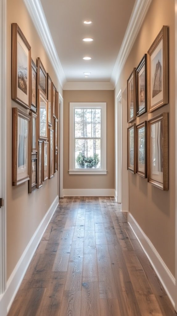 Featuring modern art and beige tones, this hallway creates an inviting gallery-like space that seamlessly blends style with comfort.