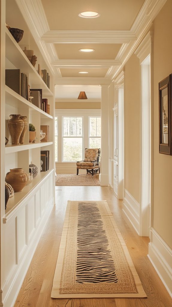 A long, beige hallway with a built-in bookshelf turns the space into a multifunctional area, combining style with practicality.