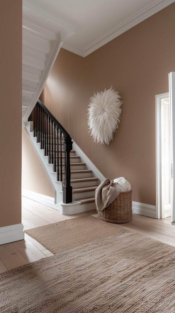 Beige tones run seamlessly along the walls, paired with an angled staircase and a textured rug, creating a dynamic yet soothing entryway.