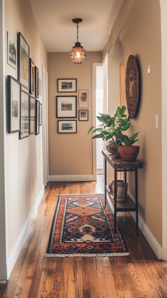 This hallway embraces texture with a woven rug and a gallery wall filled with framed artwork. The beige walls provide a neutral backdrop for the eclectic yet balanced design.