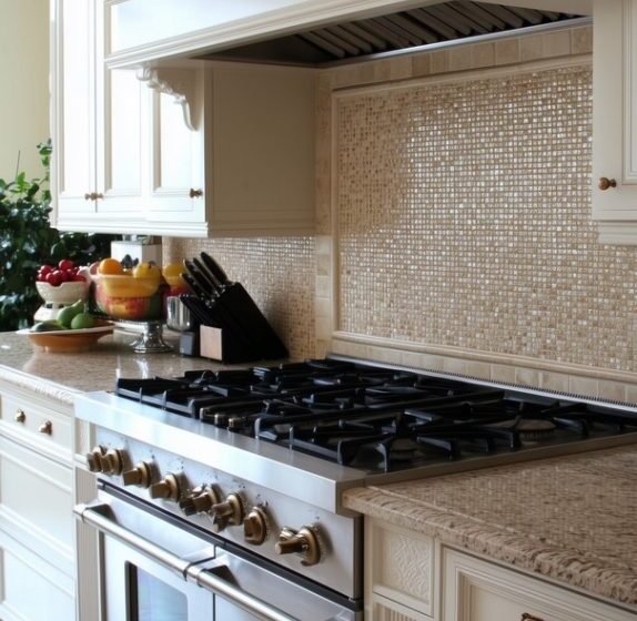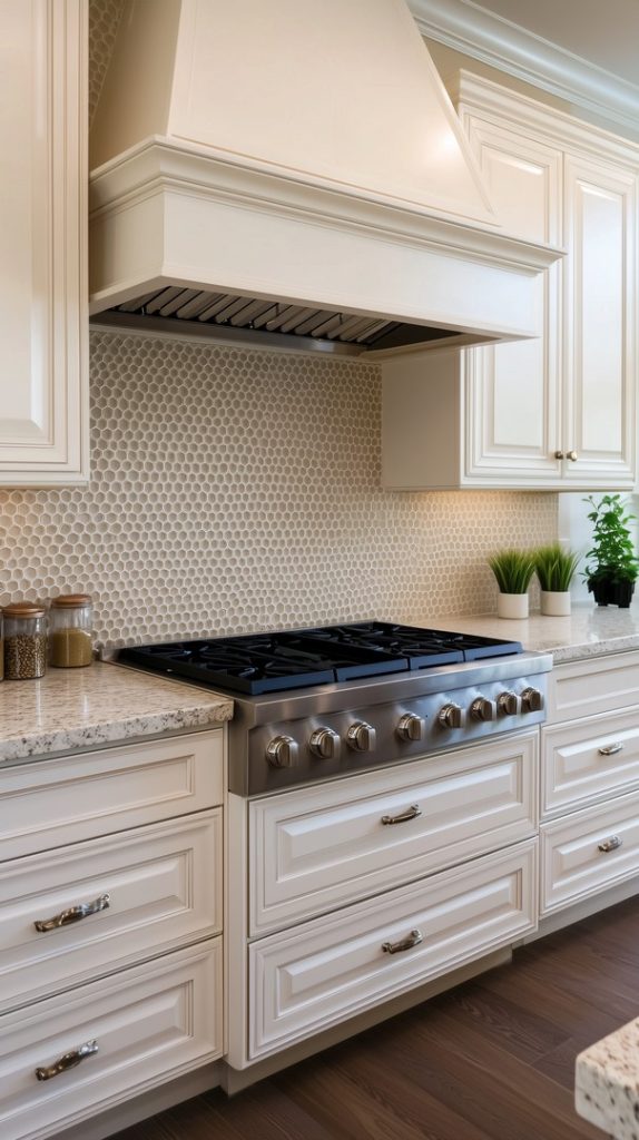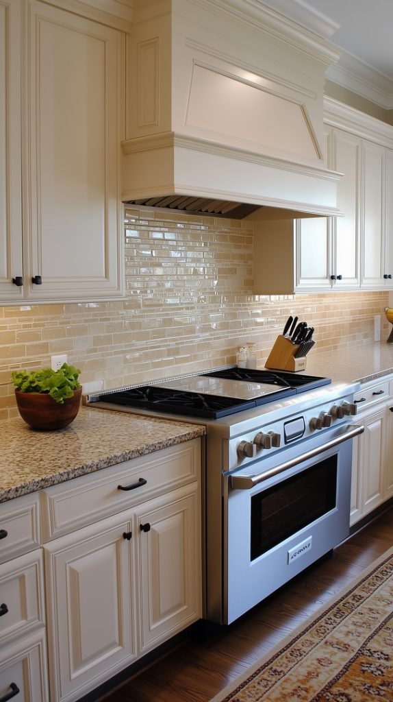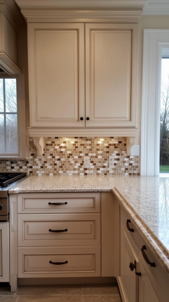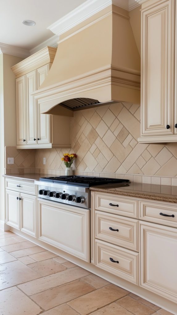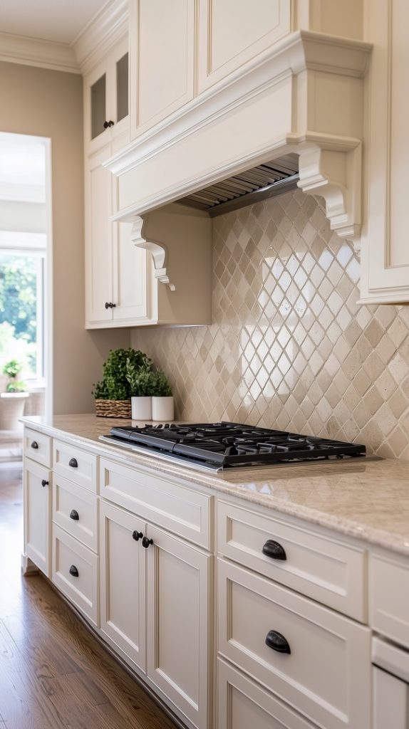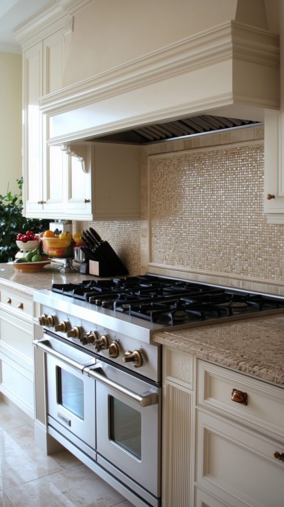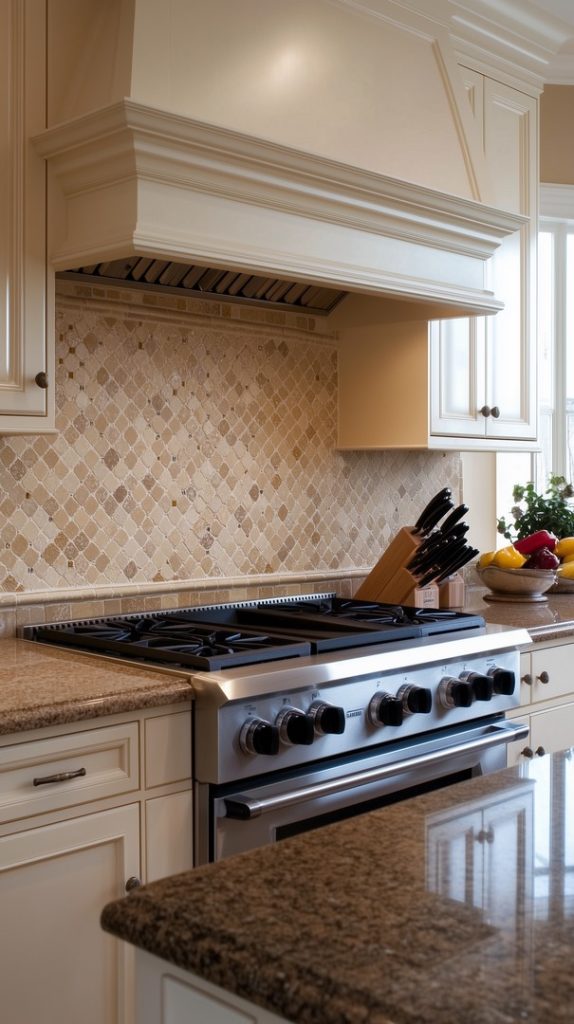 For a luxurious look, this kitchen features a mosaic beige backsplash that lends texture and elegance to the cooking area. The intricate pattern and slightly reflective finish of the tiles enhance the backsplash’s visual appeal. The cabinets in warm cream tones harmonize with the backsplash, and the sleek black countertops add a contemporary flair. The arrangement gives off an upscale feel, perfect for homeowners looking for a bit of glam in a traditional palette.