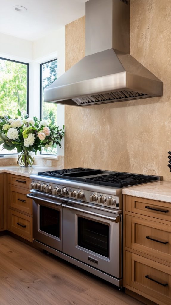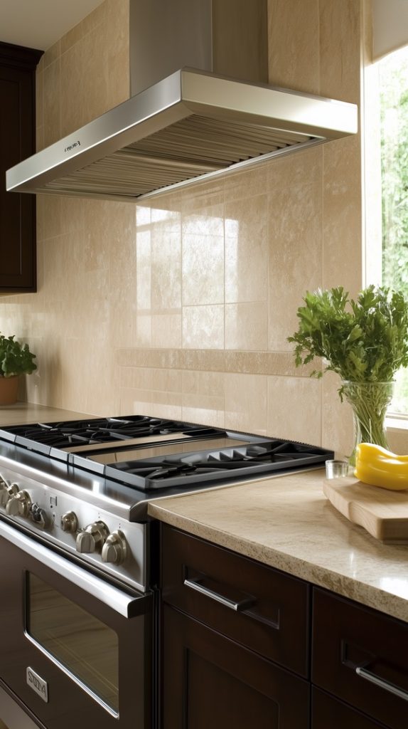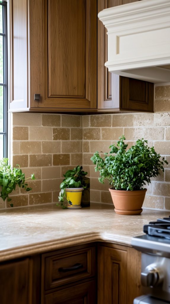 This kitchen pairs sleek, stainless-steel appliances with a beige tiled backsplash that stretches up to the vent hood. The light beige color effortlessly complements the warm wood cabinets, creating a soothing and welcoming atmosphere. This design features small rectangular tiles laid in a subtle pattern, adding a layer of sophistication. The countertop extends the theme with neutral tones, making the whole space feel cohesive. The neutral beige backdrop allows the green plant and countertop elements to pop, giving life to the overall setting.