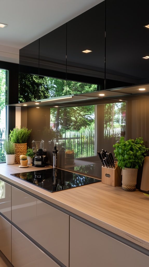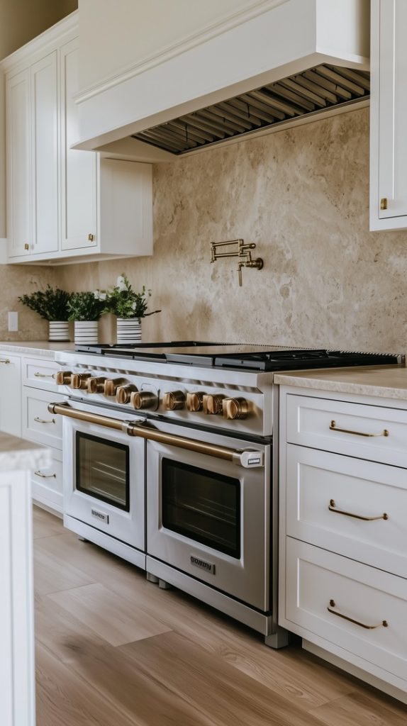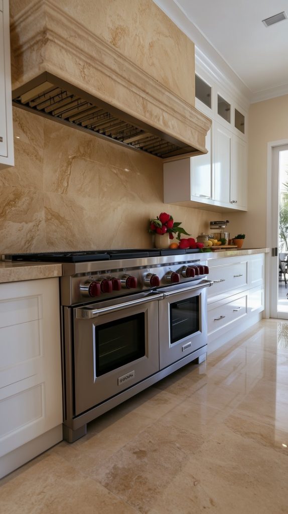 This kitchen exudes luxury with its polished marble-effect beige backsplash. The glossy, seamless surface enhances the sophistication of the cooking space while reflecting natural light to make the area feel more spacious. The backsplash’s sleek design blends perfectly with the stainless steel and white cabinetry, creating a luxurious yet welcoming atmosphere. It’s an ideal choice for those who want to make a subtle yet elegant statement.
