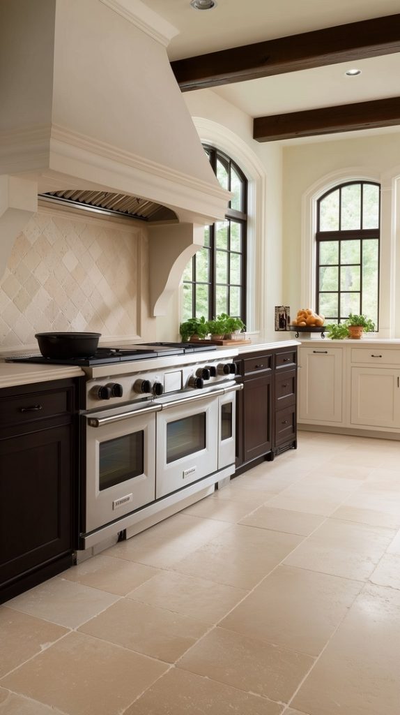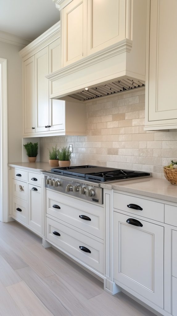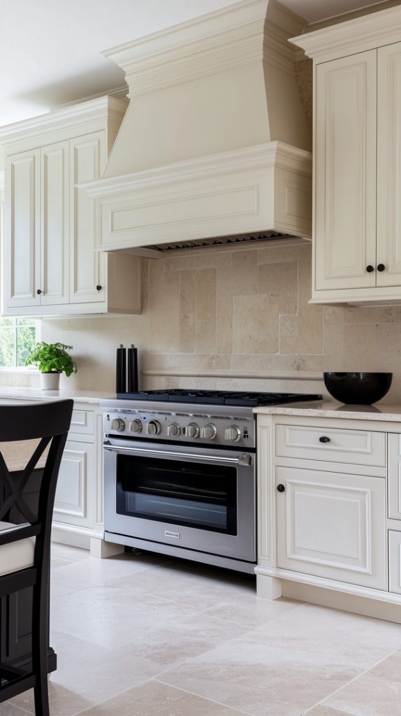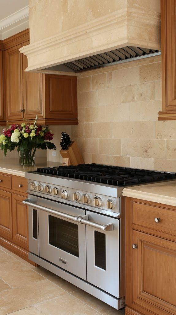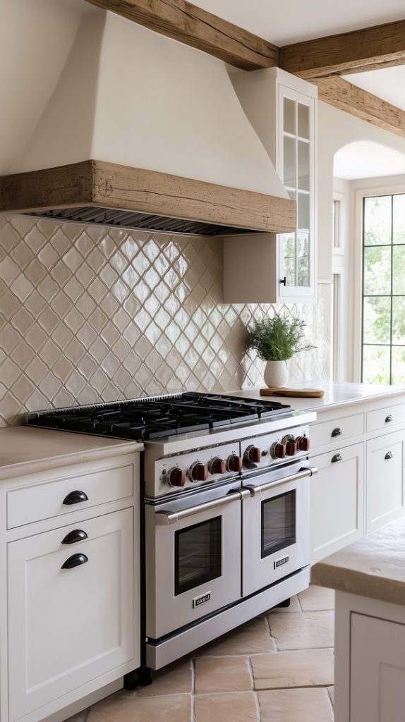 In this kitchen, rustic beige tiles are arranged in a traditional pattern, offering a warm and inviting feel. The matte finish of the backsplash contrasts beautifully with the sleek, modern appliances and white cabinetry. The wood accents on the vent hood tie the design together, adding a natural element that enhances the overall coziness of the space.