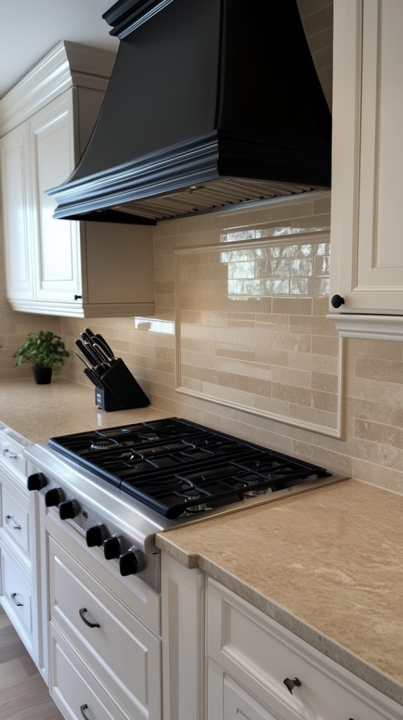 Embracing a transitional aesthetic, this kitchen juxtaposes modern and traditional elements using a beige-tiled backsplash. The glossy rectangular tiles provide a sleek background, highlighting the white cabinetry with metallic handles. A mix of light and dark tones in the tiles creates depth and interest, while the black countertop and modern fixtures bring in a contemporary vibe. This is a great choice for kitchens that aim to bridge classic and modern design influences.