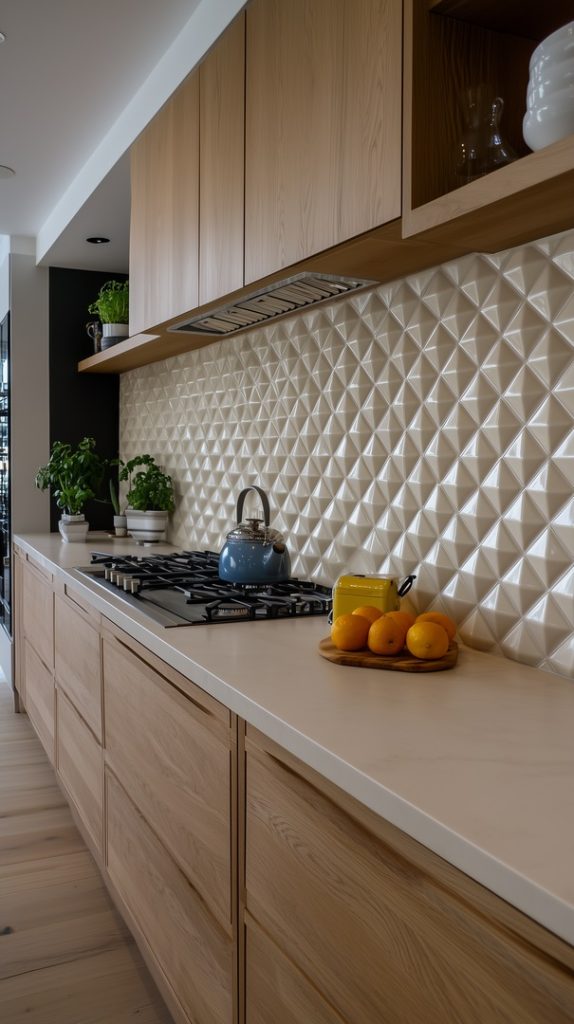 The standout feature in this kitchen is the textured beige backsplash, with a pattern that adds depth and visual intrigue. Paired with sleek countertops and minimalist cabinetry, the backsplash becomes the focal point, drawing attention to its subtle yet distinct design. It’s perfect for kitchens that aim to be understated while still showcasing unique design elements.