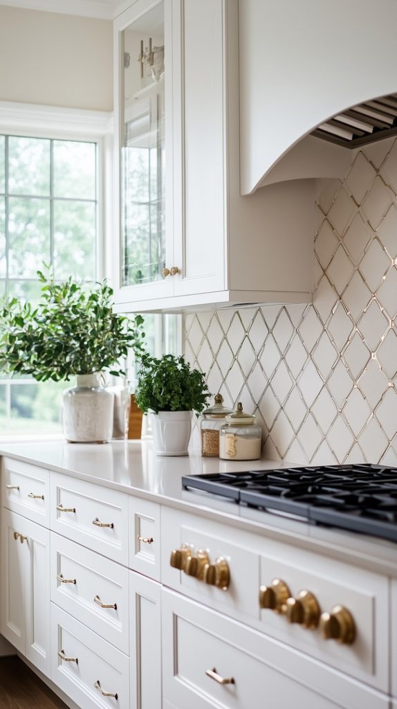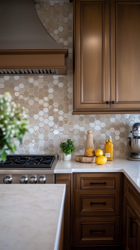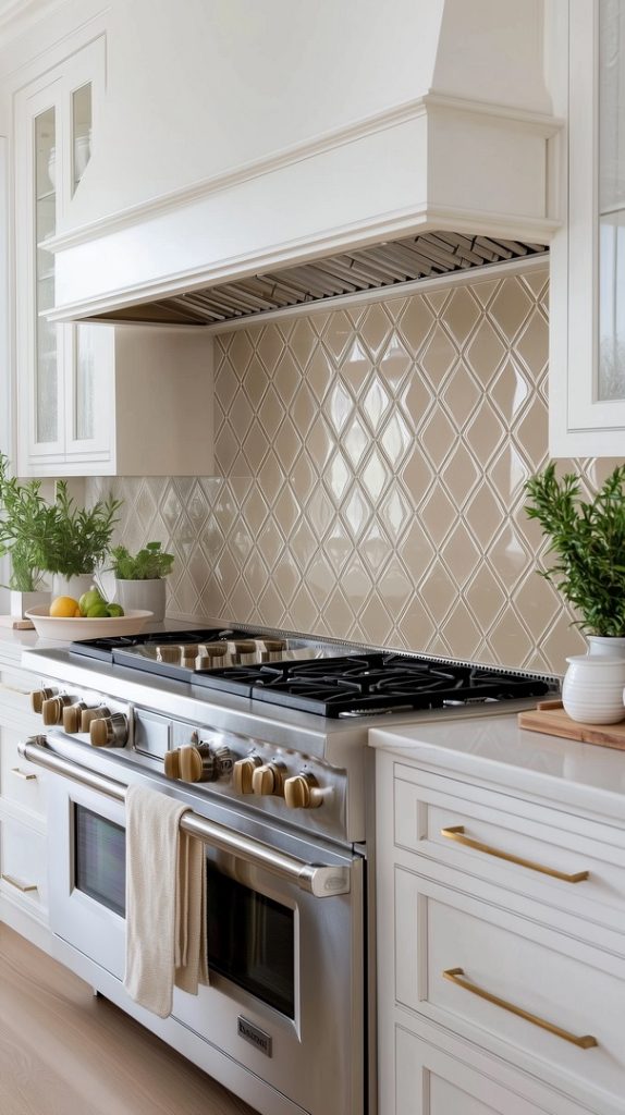 The final design in this series showcases geometric beige tiles that add modern flair to the kitchen. The repeating patterns create visual interest while the neutral tones keep the space feeling serene and balanced. It’s the perfect backsplash for those who want a unique design element that still blends seamlessly with the rest of the kitchen decor.
